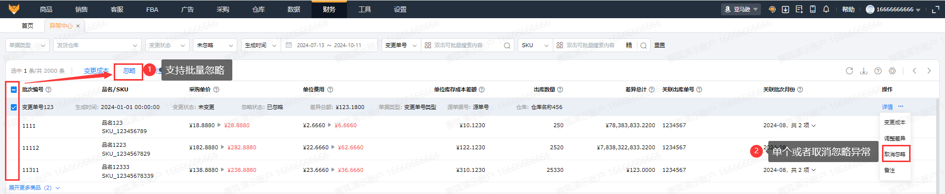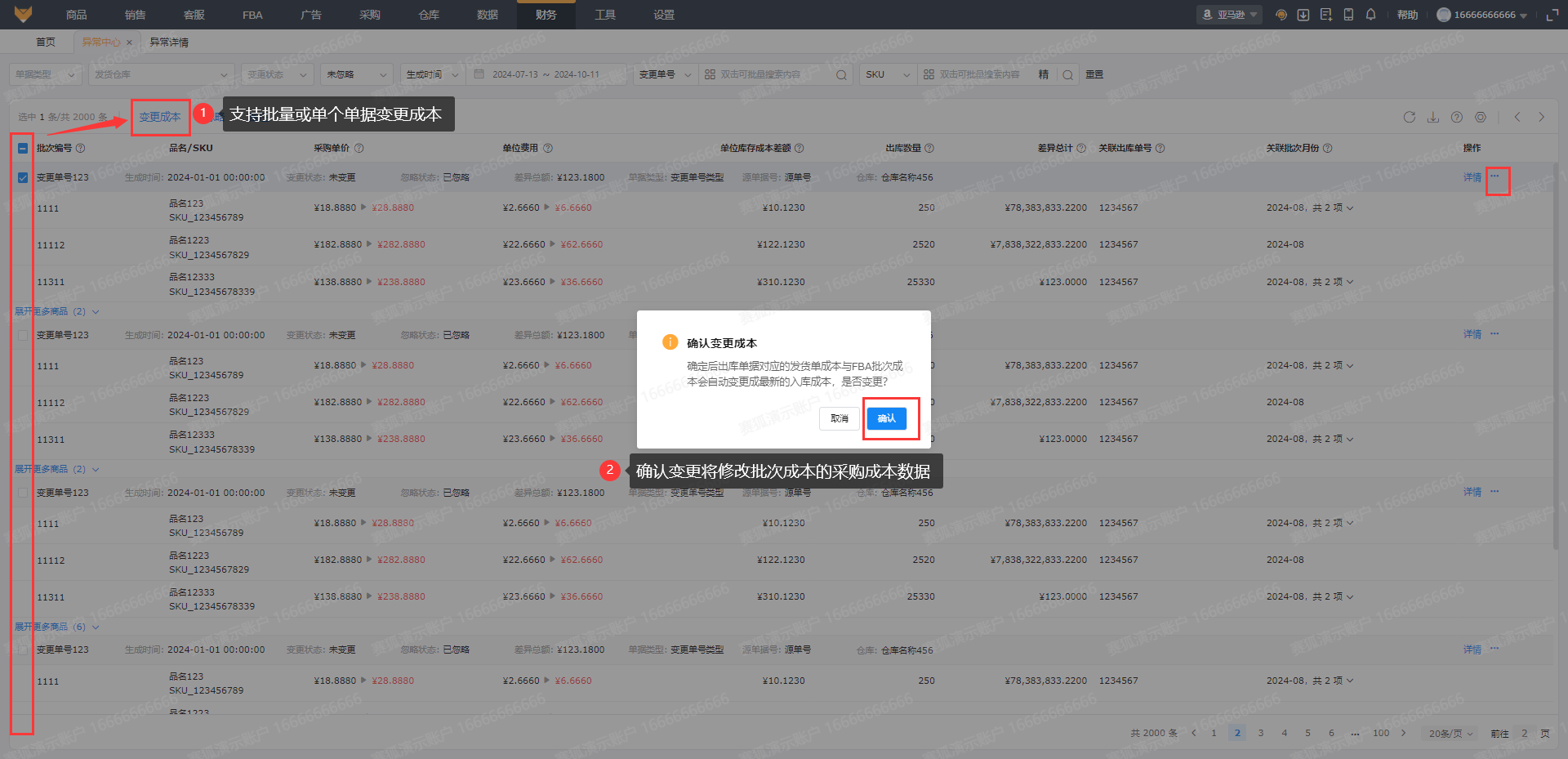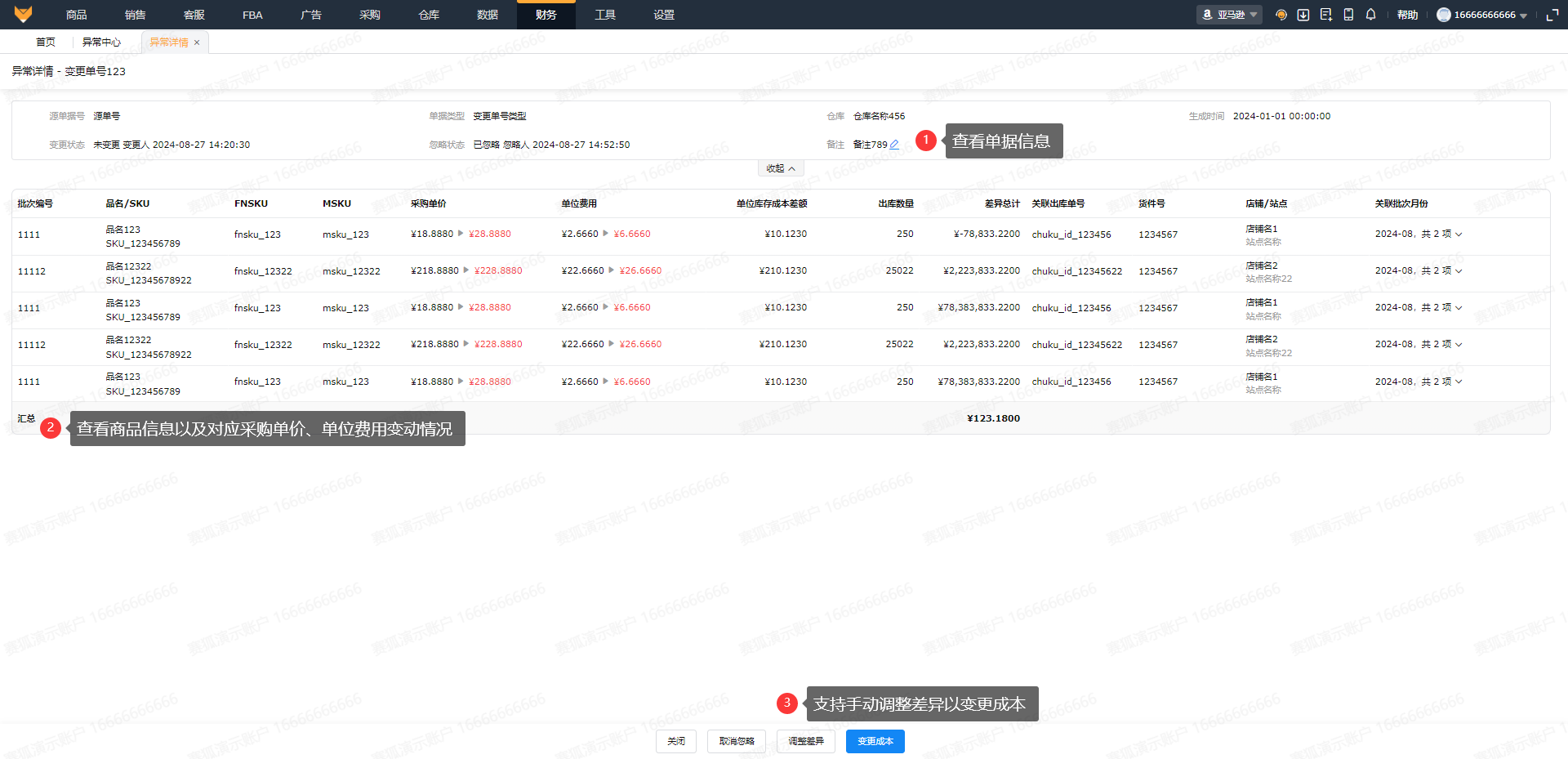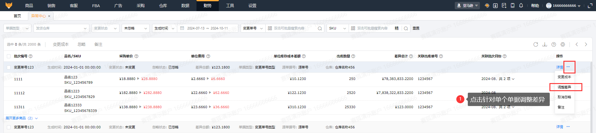 支持查看变更的对应批次编号、SKU、对应变更的采购单价和单位费用、单位库存成本差额、出库数量以及差异总计等字段数据