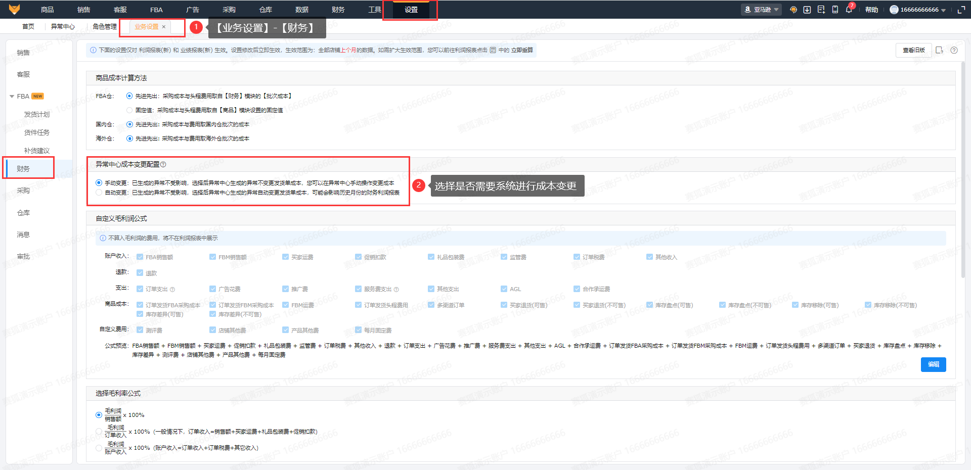 通过【设置】-【业务设置】-【财务】,修改异常中心成本变更配置,可选择手动或者系统自动完成变更