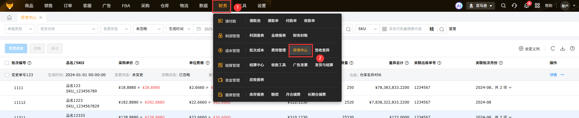 点击【财务】-【异常中心】查看