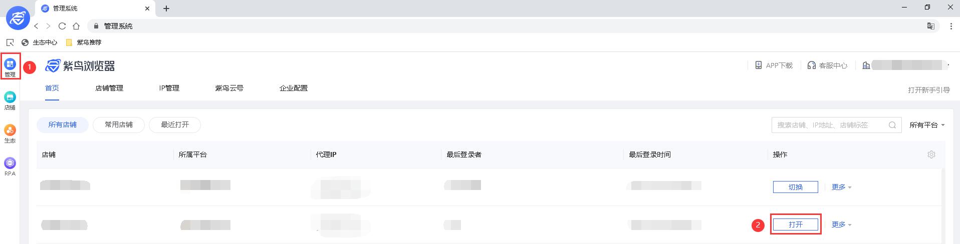 第一步:需要先进入紫鸟浏览器>管理系统>选择店铺IP,点击“打开;