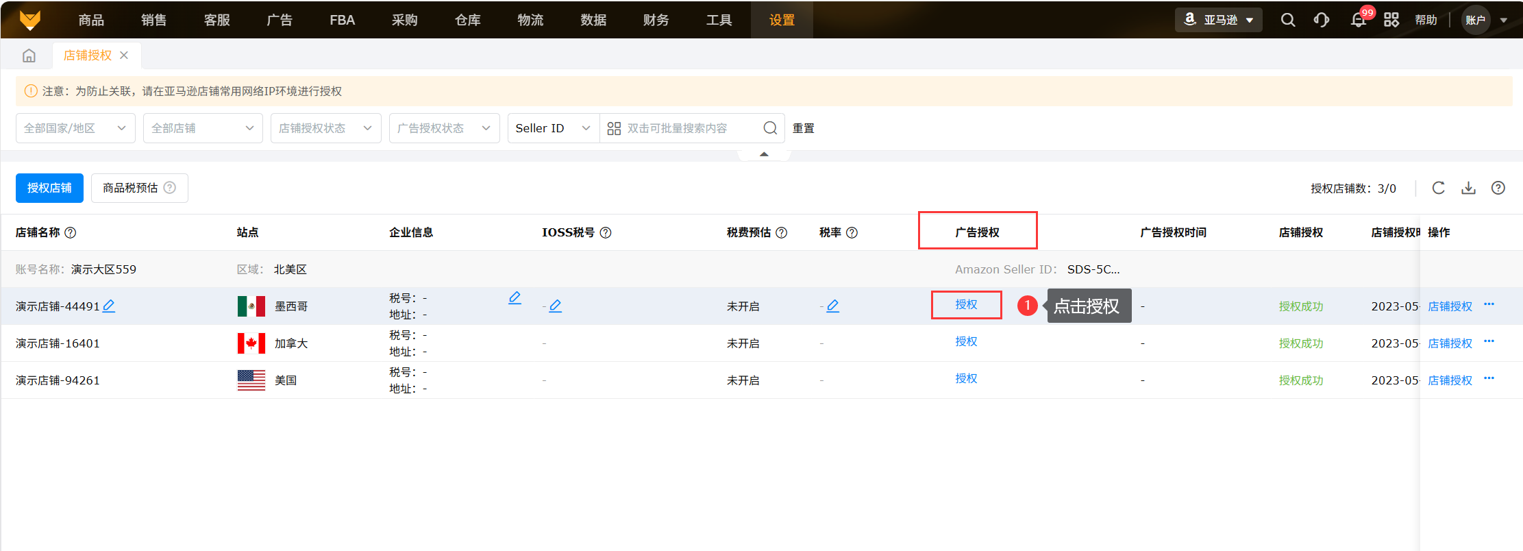 支持广告批量授权:在同一个账号,同一个大区里,授权了其中一个店铺其他店铺的广告也可以自动授权上;