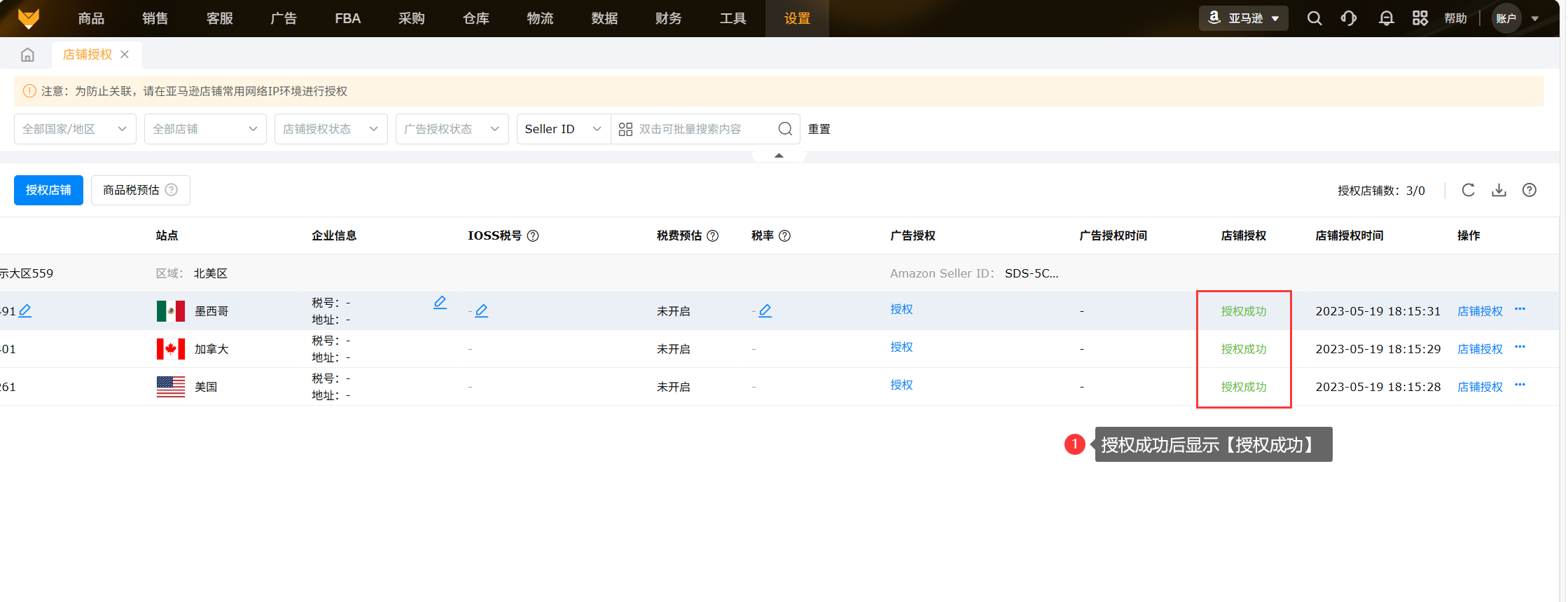 (5)操作完成后,在赛狐页面显示店铺【授权成功】。