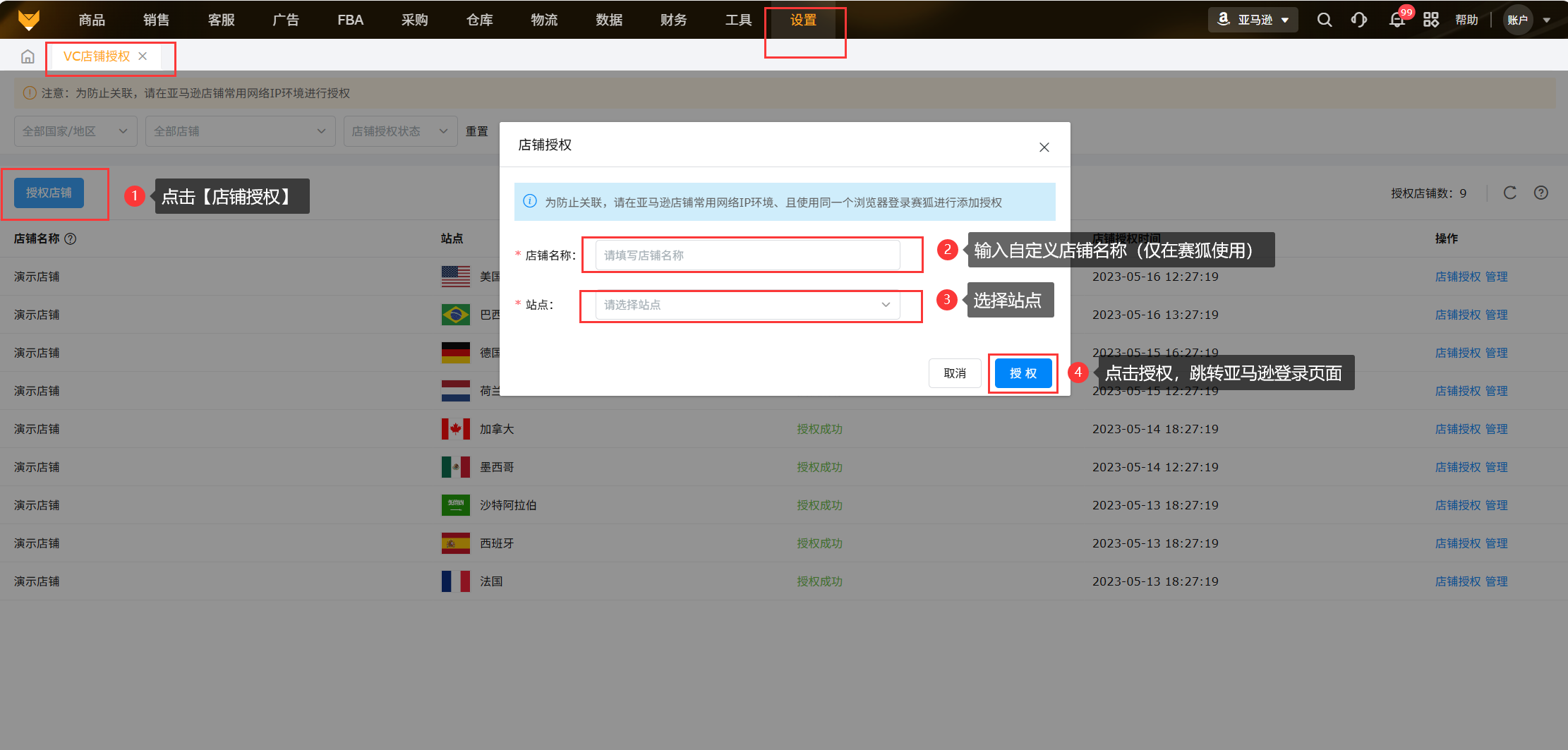 (5)入口:【设置】>【店铺授权】,点击广告【授权】将跳转到亚马逊登录页面即可进行授权。