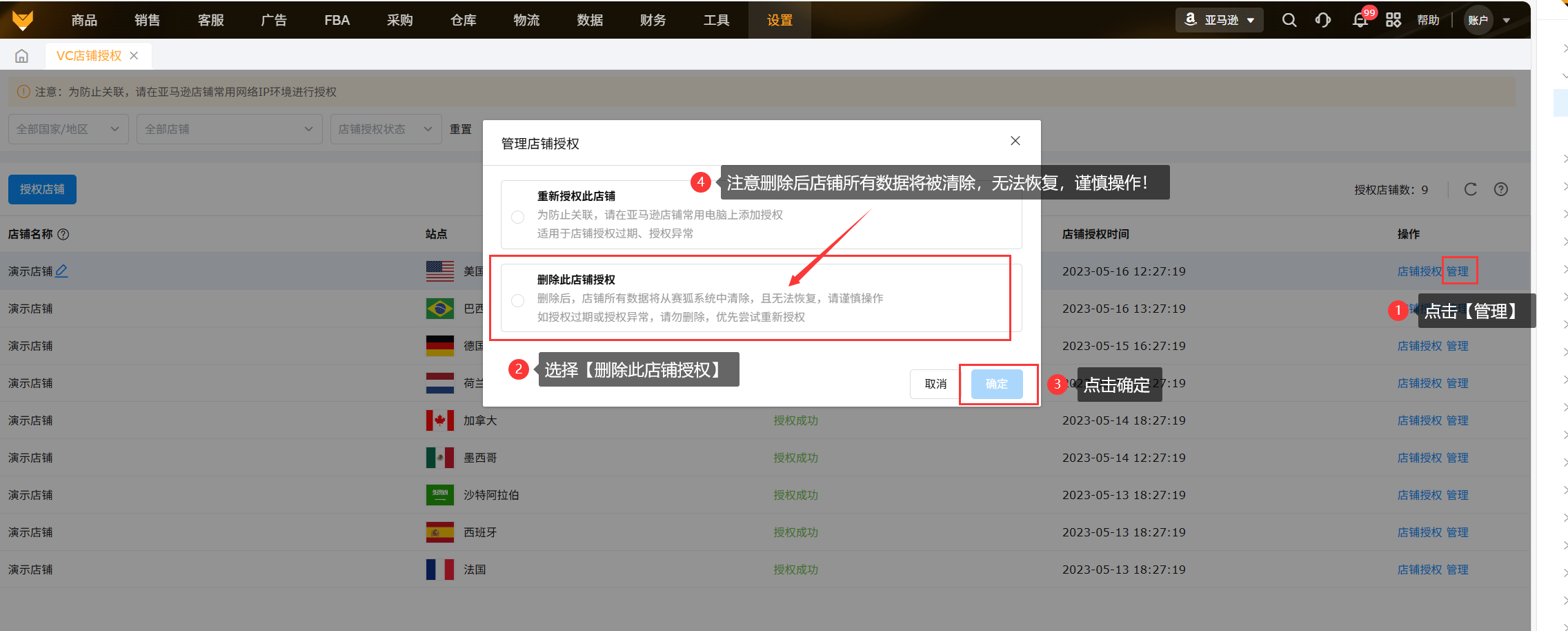 右侧【管理】,进入管理店铺授权可以删除店铺授权。(删除店铺授权后所有数据都被清除,无法恢复,谨慎操作!)