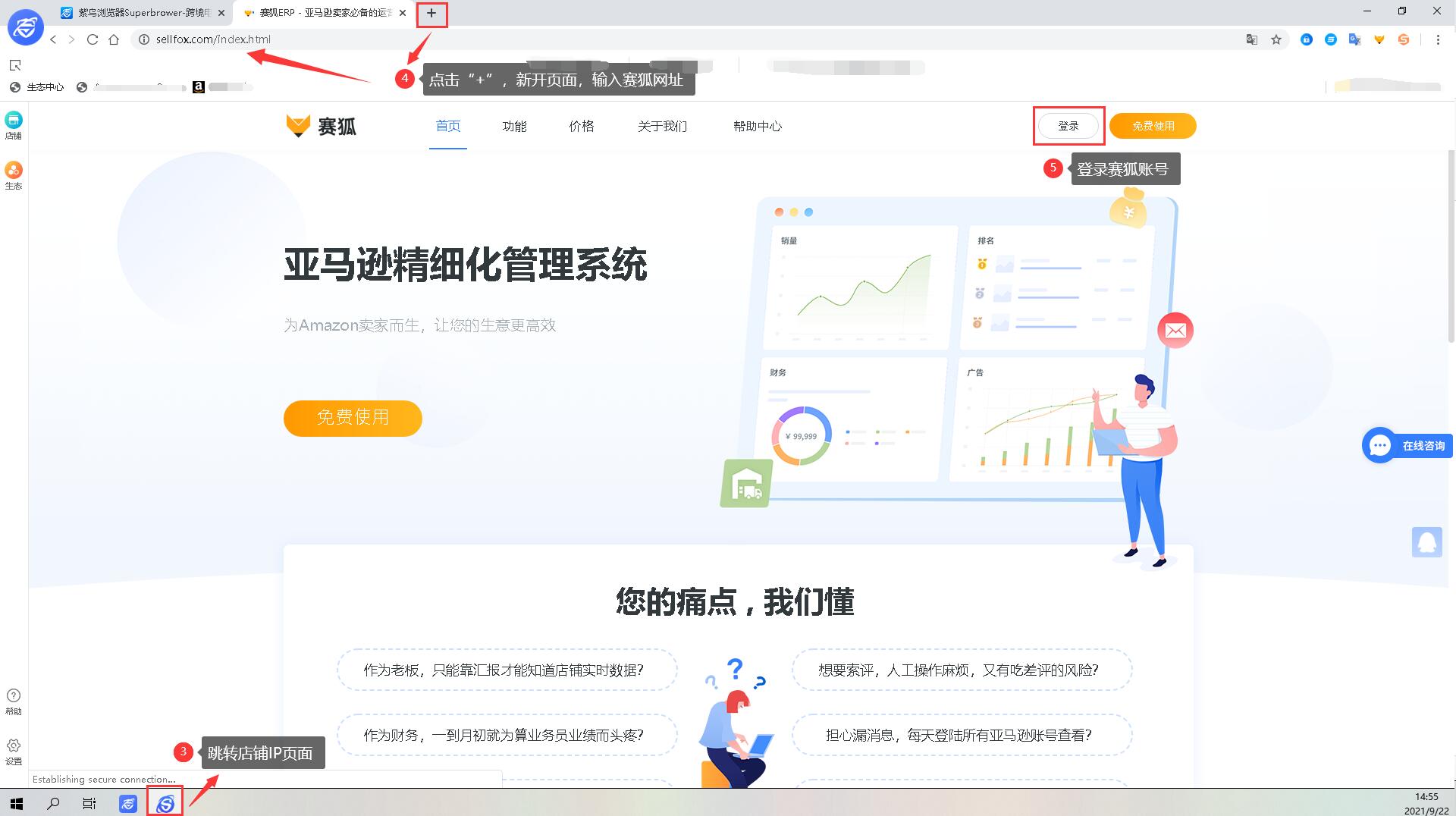 第二步:随后会跳转新的IP页面,点击“+”新开页面,输入赛狐网址https://www.sellfox.com,登录账号授权。