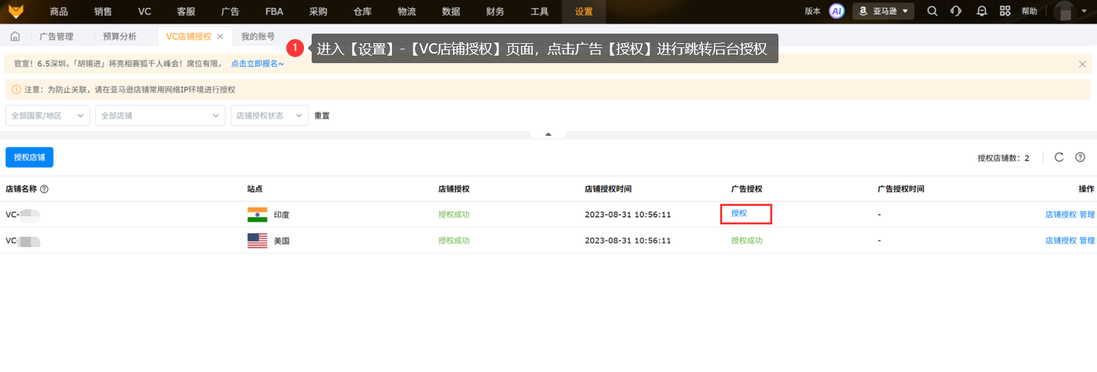 (2)需添加店铺再进行广告授权,注意切换到对应站点,无论授权了多少店铺在哪里登录赛狐都不存在关联问题;