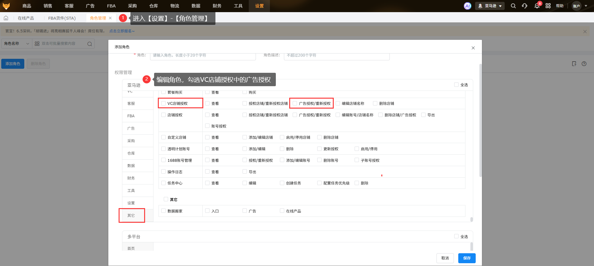 子账号需要进行广告授权,先通过【设置】-【角色管理】,开启对应权限