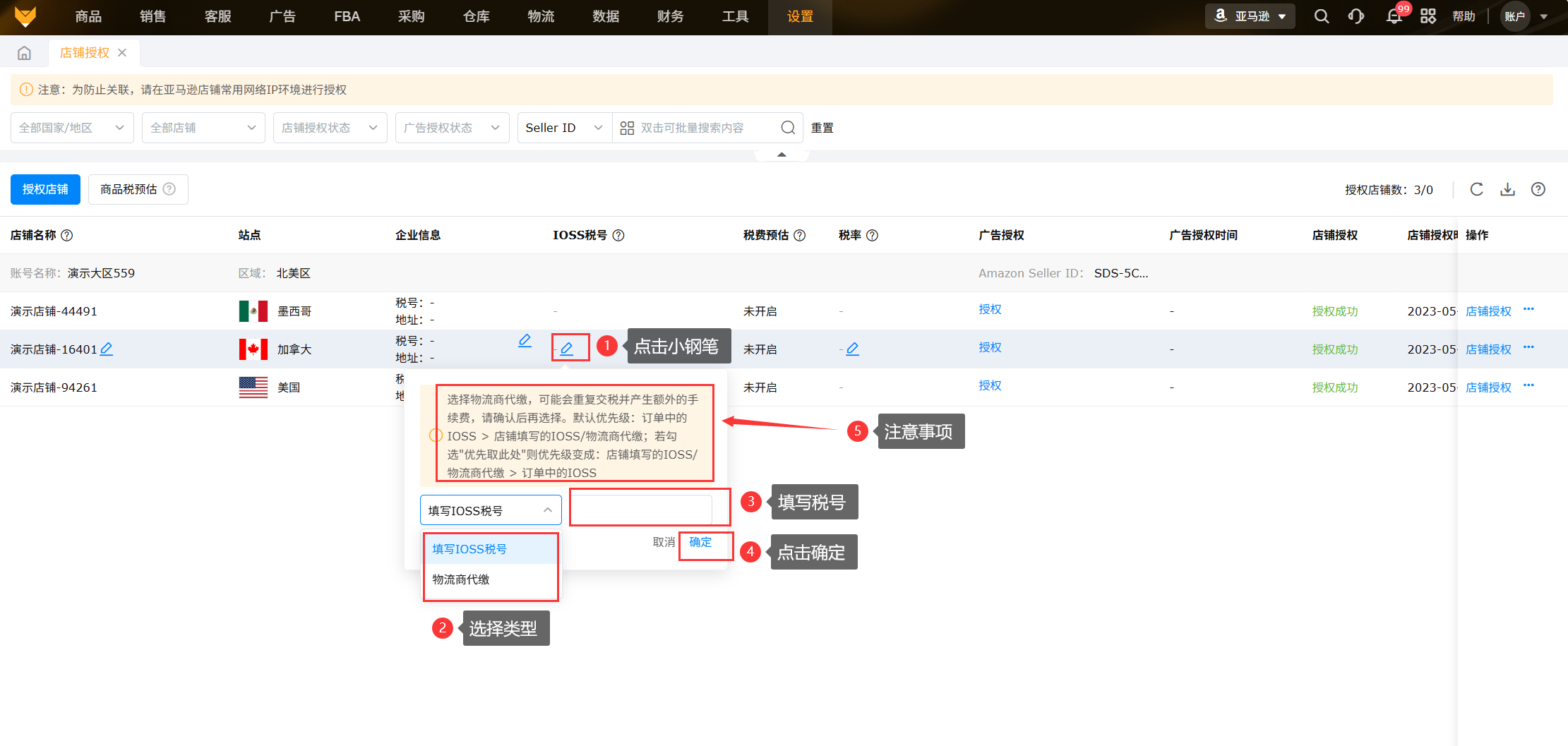 (6)欧盟税号,将税号填入对应授权店铺里,如IOSS税号,IOSS税号可以找亚马逊获取;