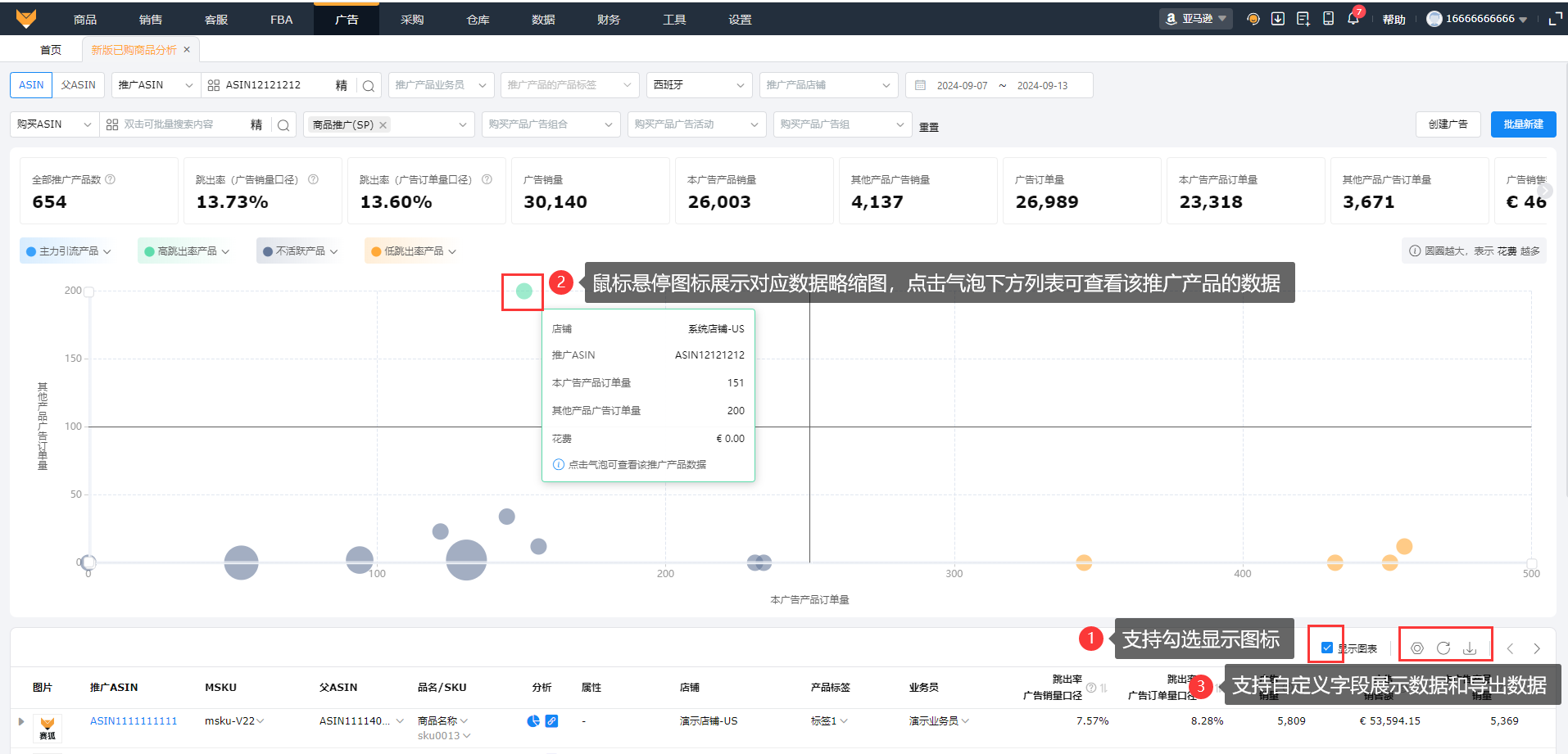 勾选展示图表,页面展示气泡图,横轴表示本广告产品订单量,纵轴表示其他产品广告订单量,气泡表示花费,气泡越大表示花费越多;鼠标悬停气泡展示对应数据略缩图,鼠标点击气泡可以在下方列表查看对应推广产品的数据;