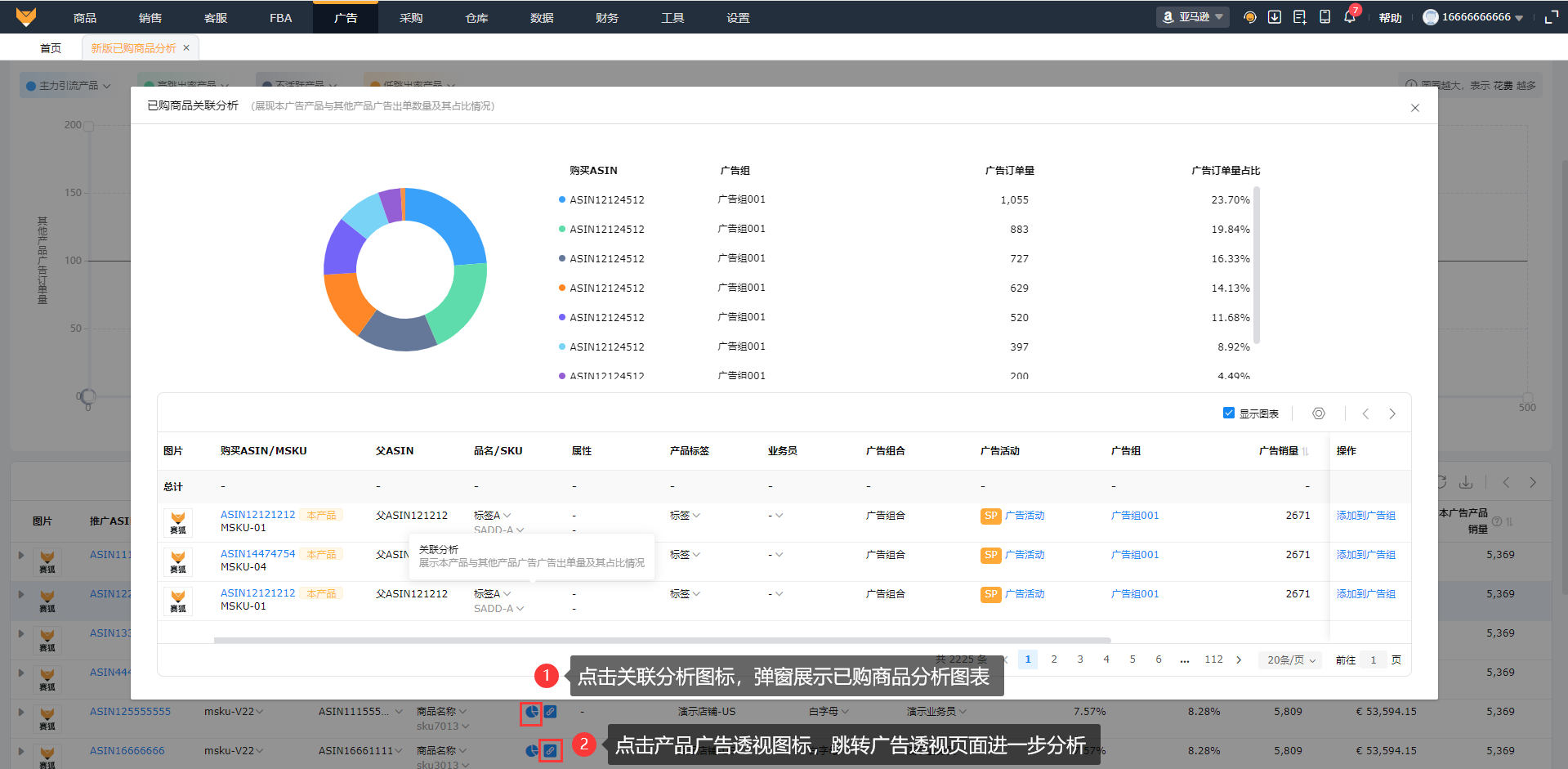 点击关联分析图标,弹窗展示已购商品关联分析图标;点击产品广告透视图标,跳转至产品广告透视页面,可以进一步进行数据分析。