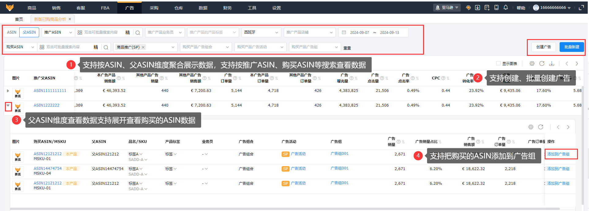 支持按ASIN、父ASIN维度聚合展示数据;支持按推广的ASIN、购买的ASIN精确和模糊搜索查看数据;