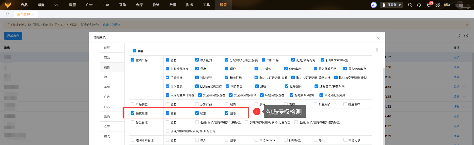 【设置】-【角色管理】勾选侵权检测权限。