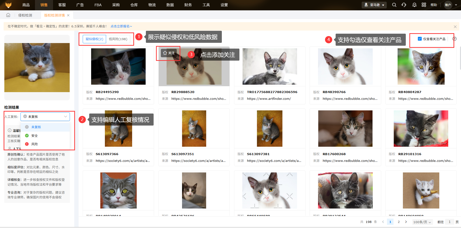 (3)版权检测详情展示疑似侵权和低风险数据,支持添加关注并勾选仅查看关注产品;