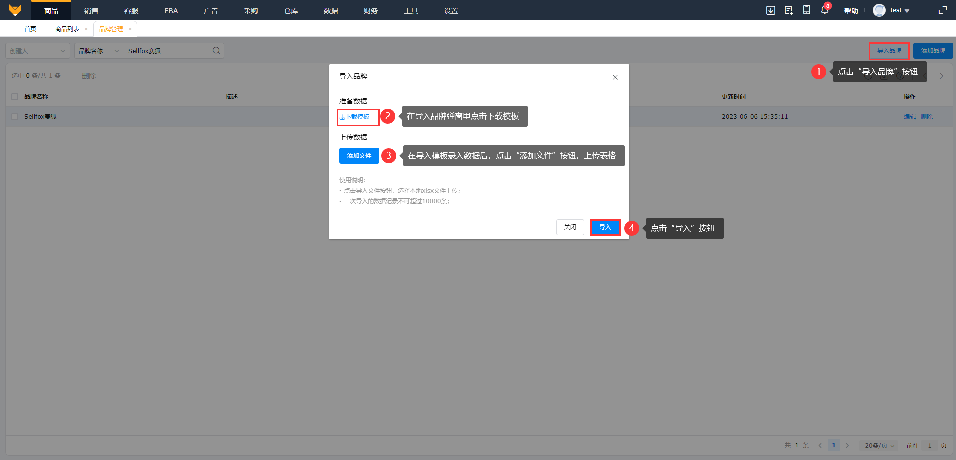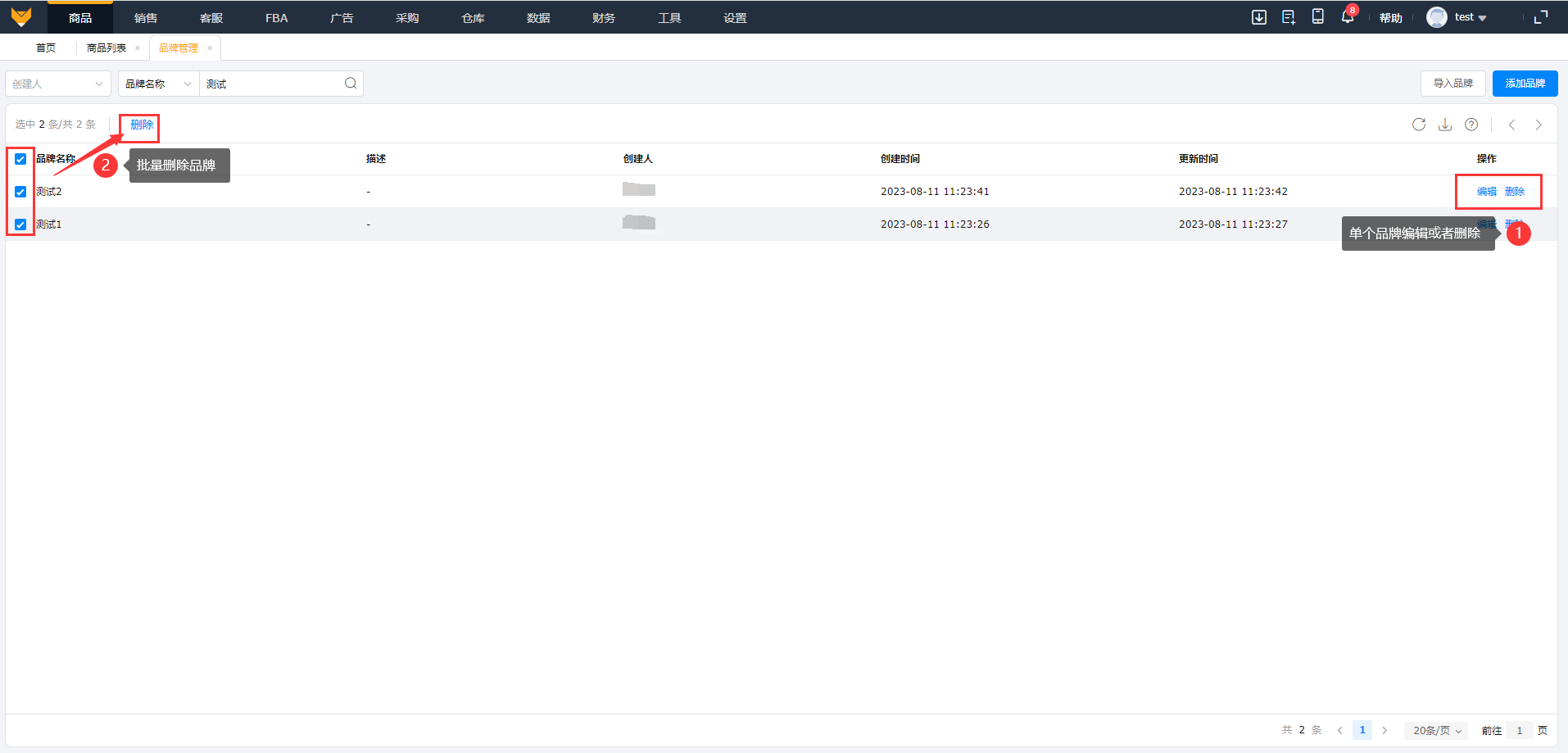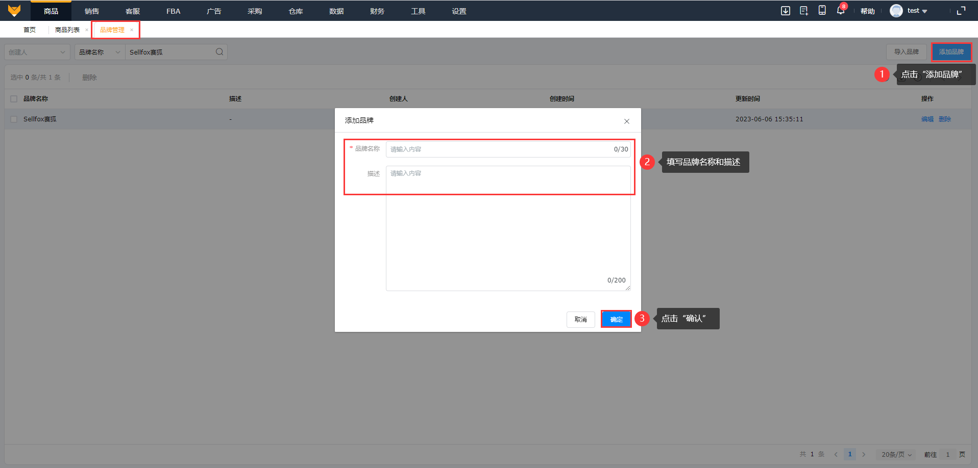 点击“添加品牌”,填写品牌名称和描述。添加的品牌名称不能重复。