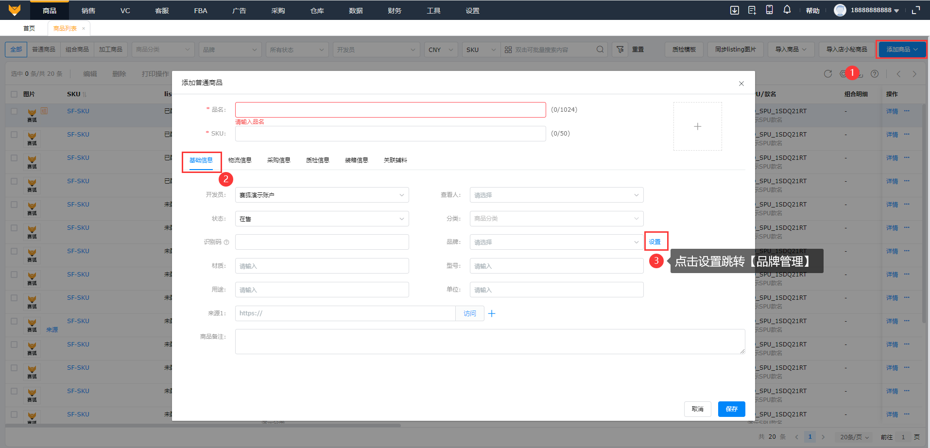 在商品列表添加商品时,填写基础信息,可点击品牌后方设置进入【品牌管理】。