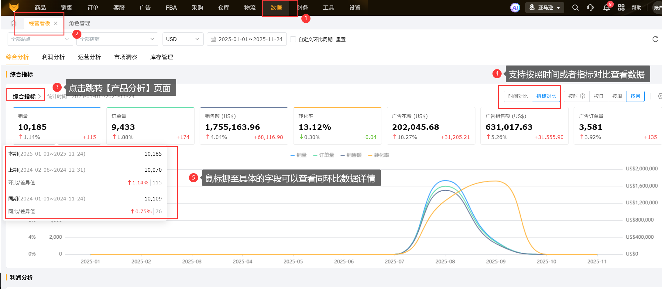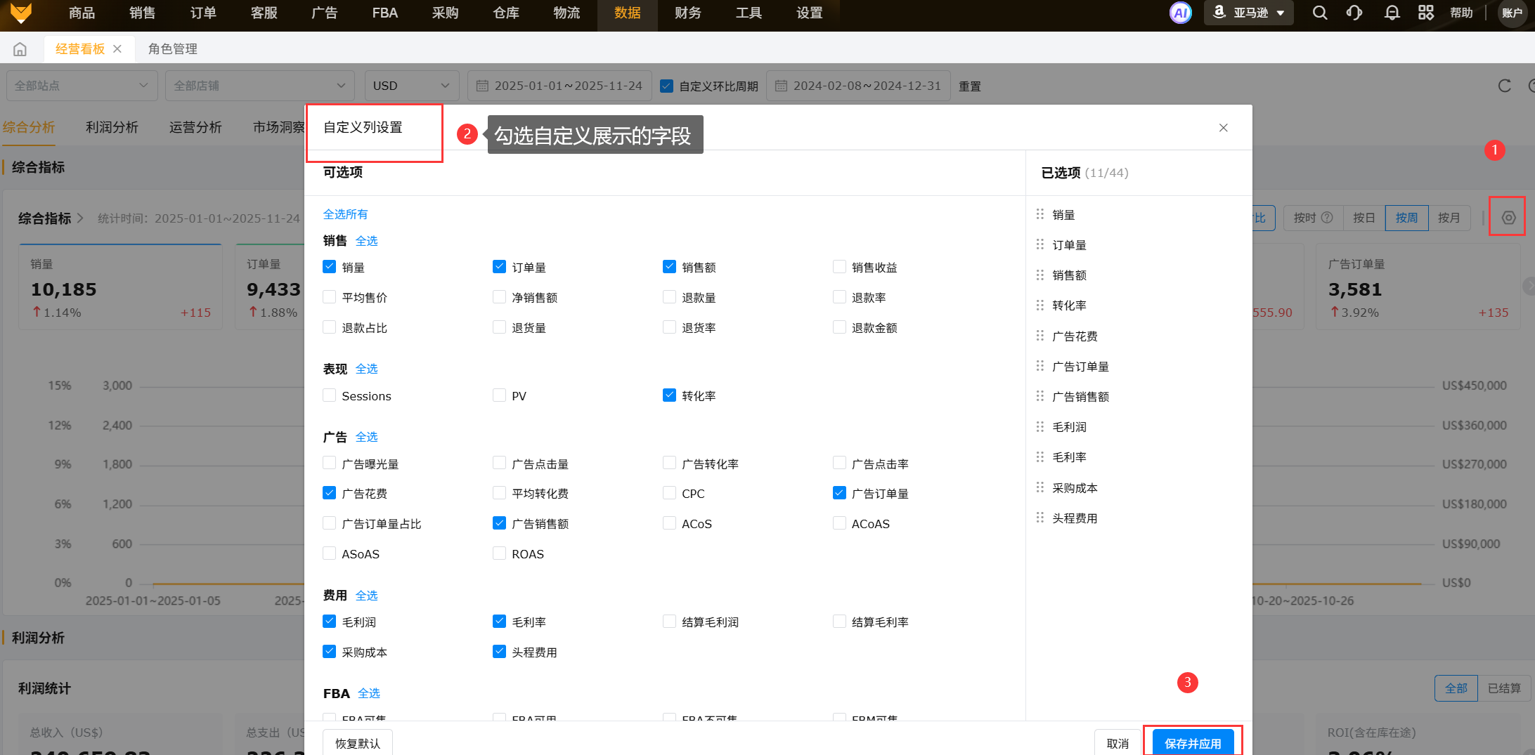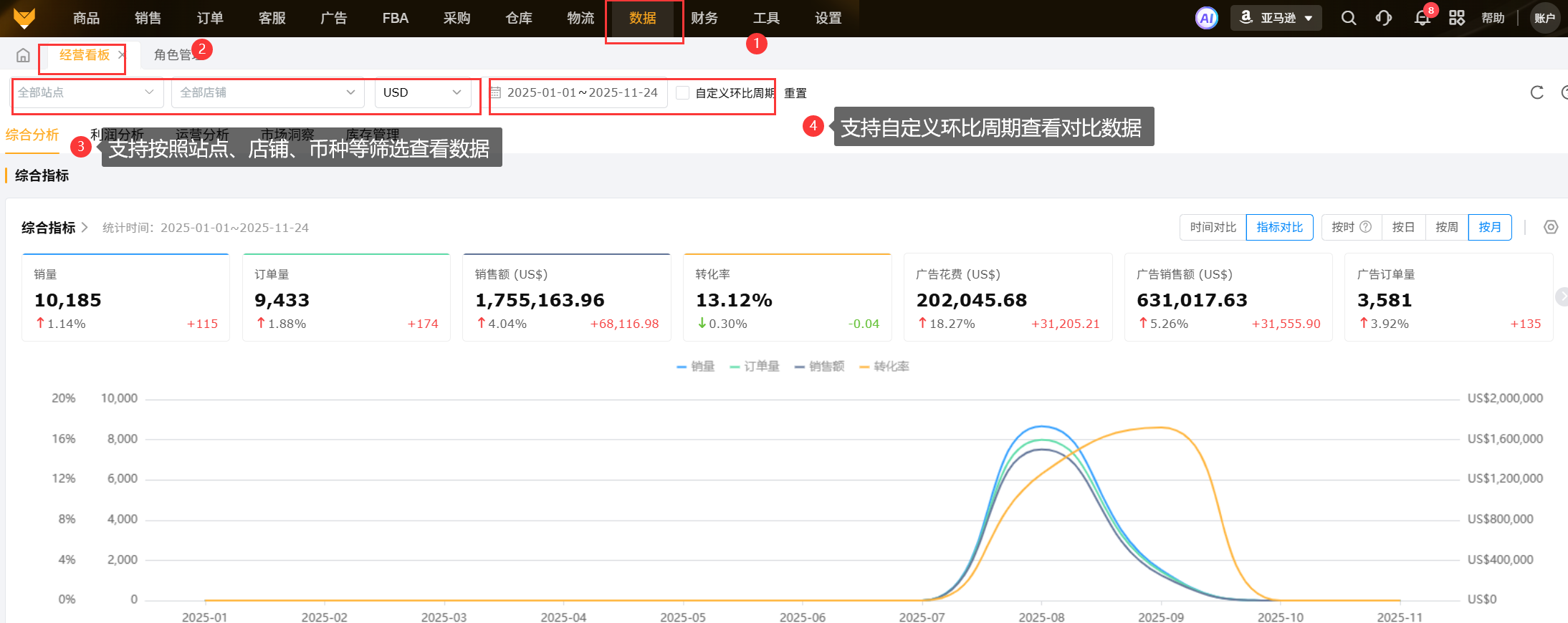③采用金额刻度的指标有:销售额、广告花费、平均转化费、CPC、广告销售额、毛利润、 采购成本、头程费用。