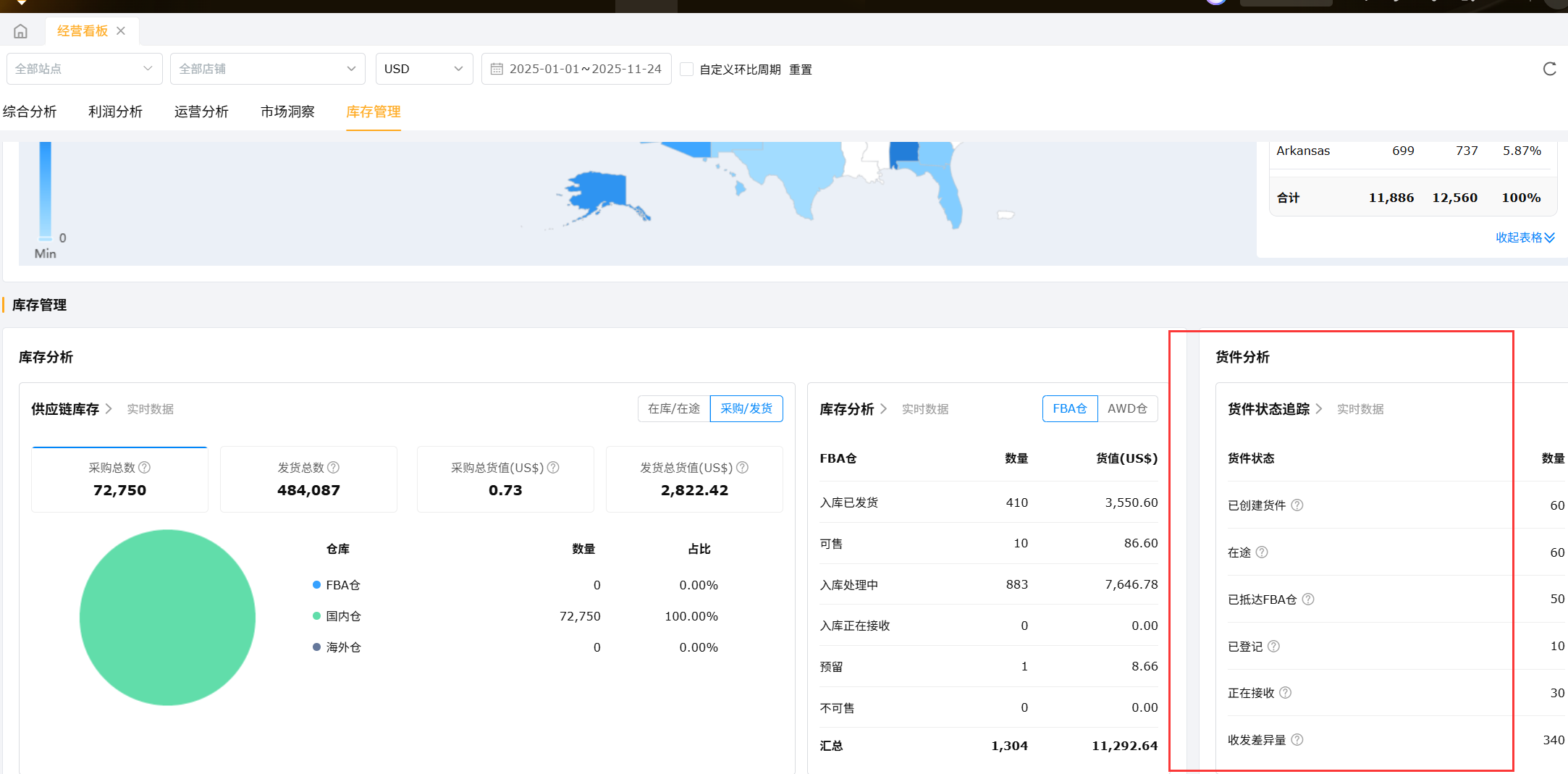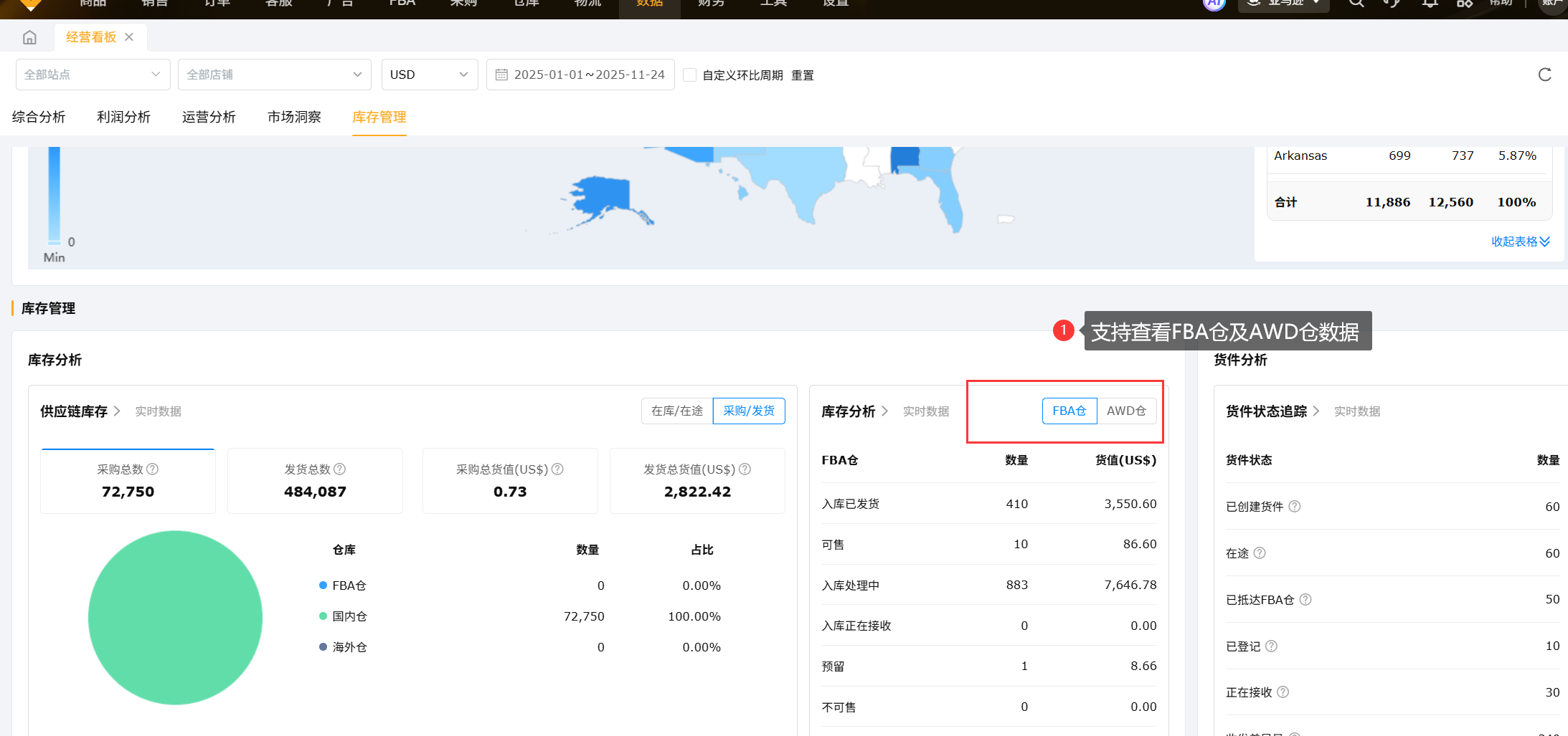 库存状况展示库存各项指标的具体数值,任意点击一个指标,可以查看该指标FBA仓、国内仓、海外仓对应的数据和占比,方便评估供应链库存数量、供应链库存资金,以及各类型仓库的情况。
