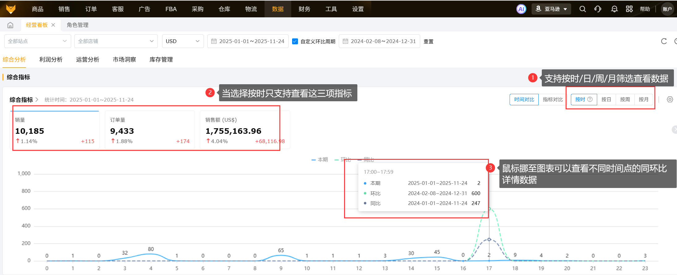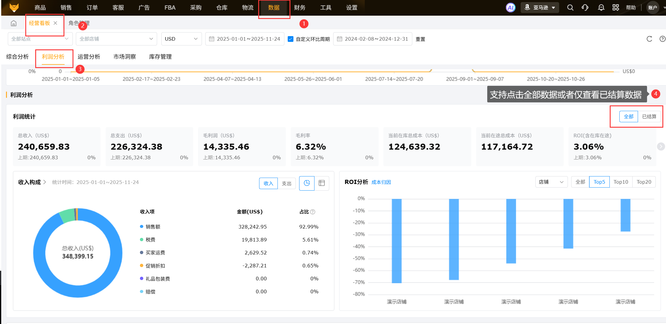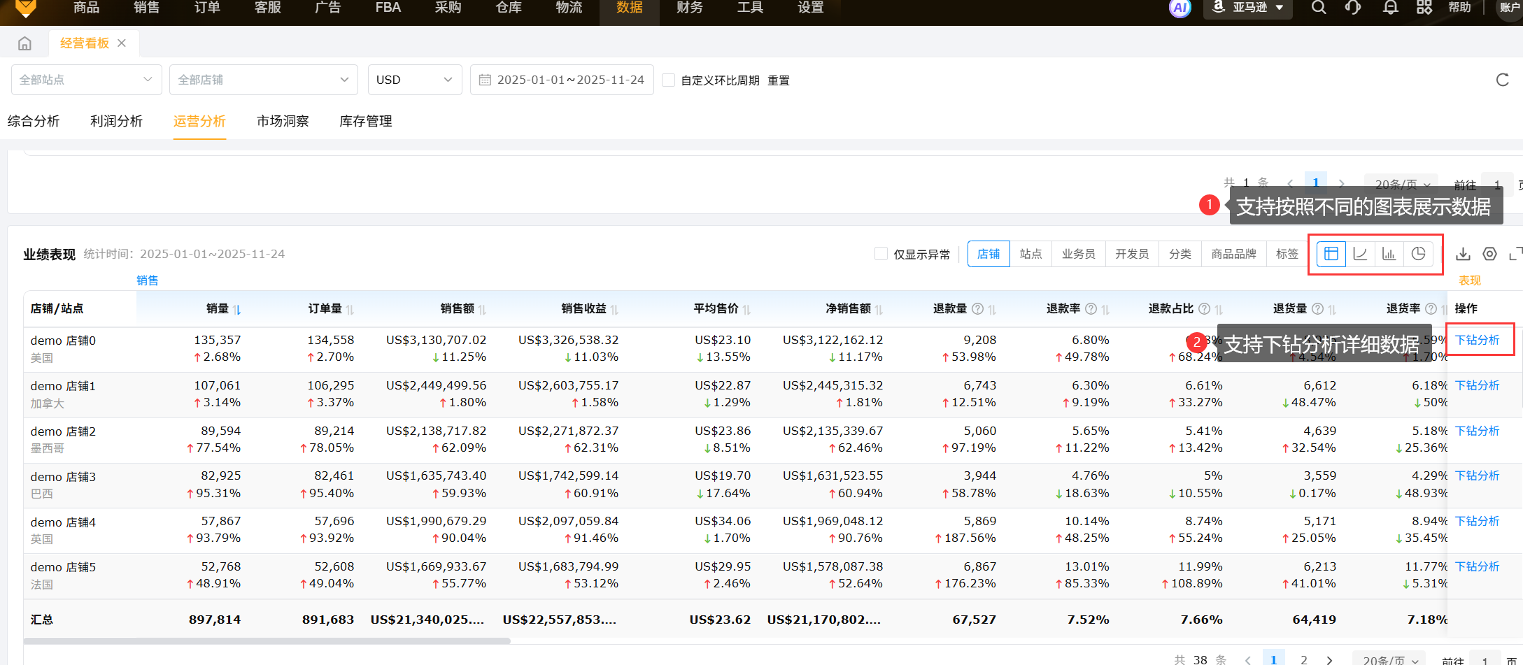 经营看板统计店铺维度汇总数据,包含店铺的综合分析、利润分析、运营分析、市场洞察、库存管理等功能,实现店铺间的数据聚合,将数据直观化,使运营分析更快捷、高效。