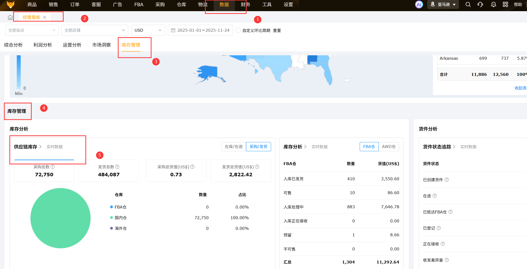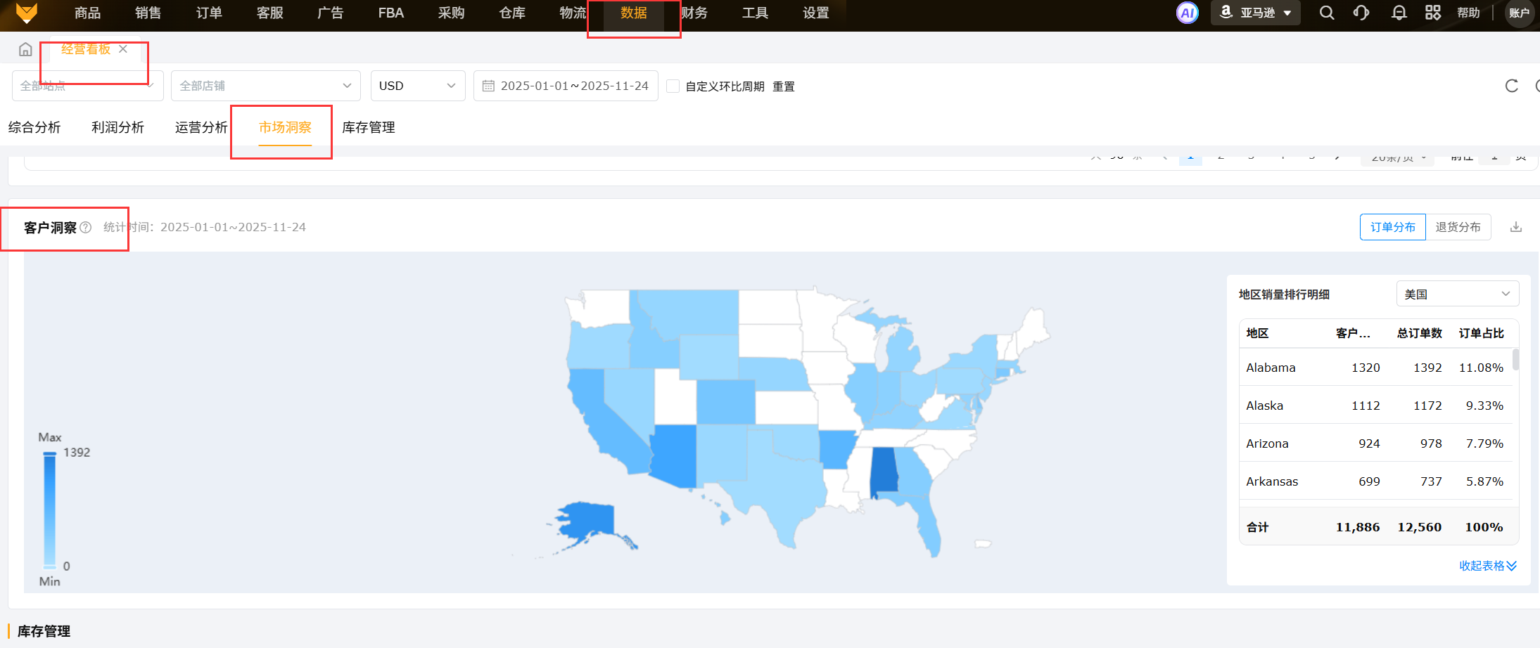 ①数据来源及更新时效:取【订单】-【全部订单-亚马逊】的订单地址分布统计;