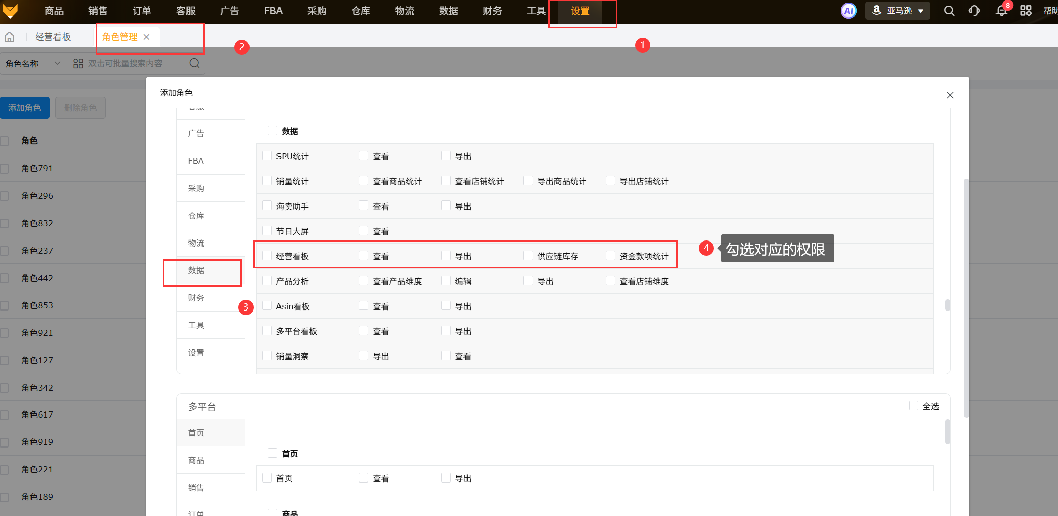 主账号给子账号分配查看权限,在【设置】-【角色管理】添加角色,填写角色名称,选择数据模块,勾选相应权限,点击保存。