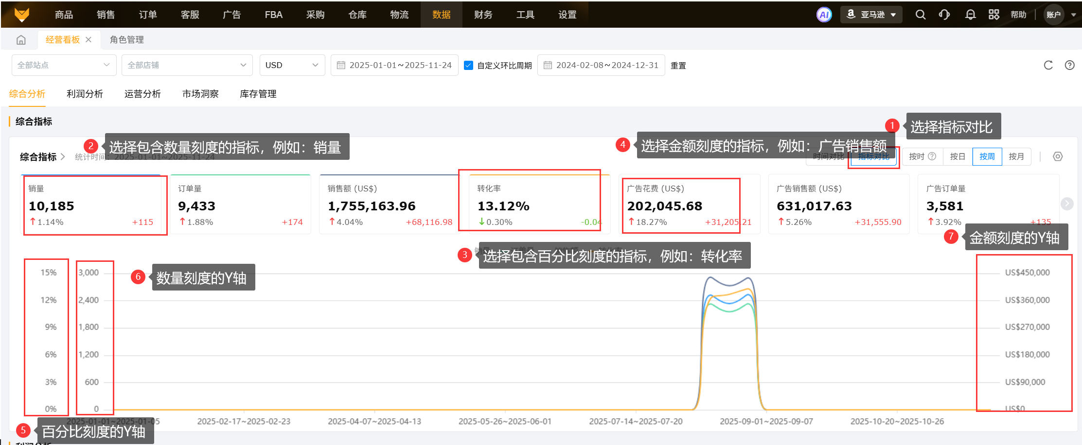 ①采用百分比刻度的指标有:退款率、退货率、转化率、广告转化率、广告点击率、广告订单量占比、ACoS、ACoAS、ASoAS、ROAS、毛利率;
