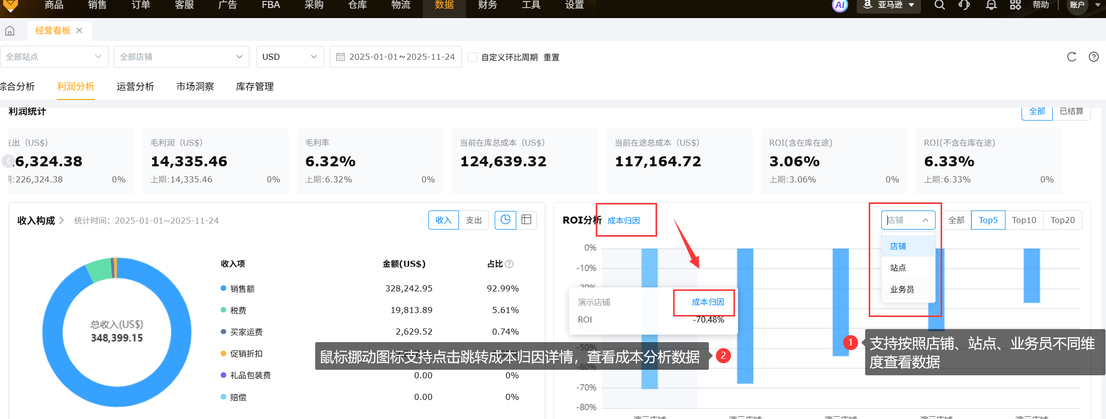 从销售、利润、库存、广告、售后5个核心维度来分析产品/店铺/人员带来的效益表现