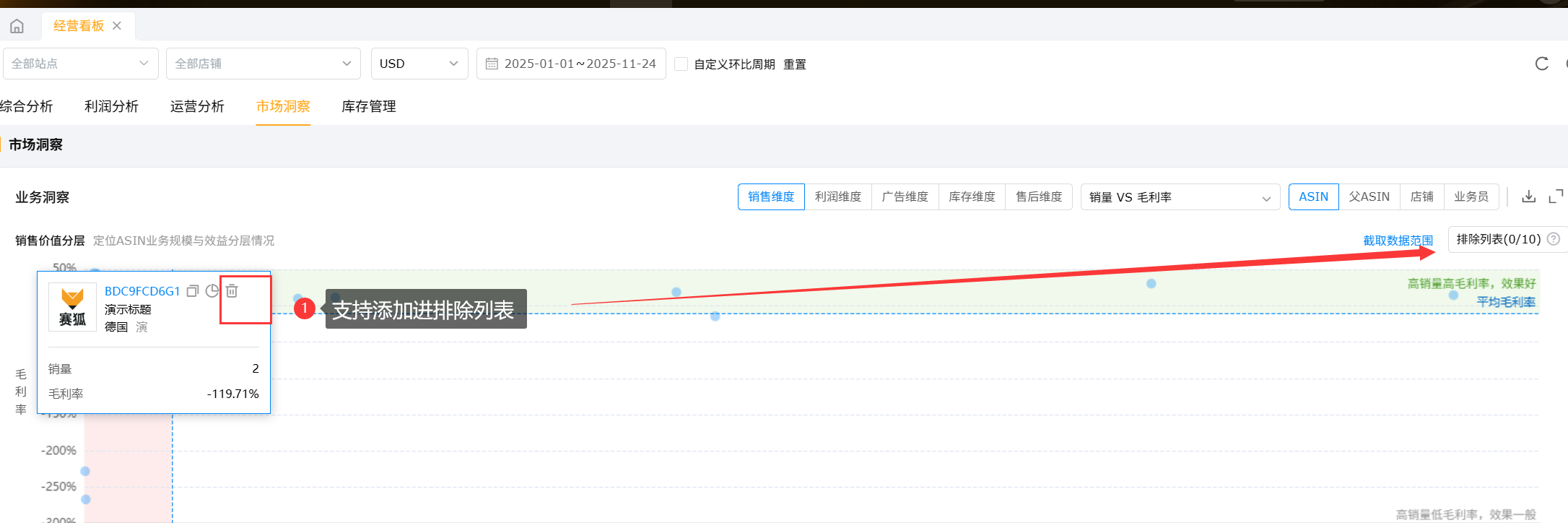 第一象限:高销量高毛利率,效果好【(区域用绿色)】;第二象限:低销量高毛利率,潜力大;第四象限:高销量低毛利率,效果一般;第三象限:低销量低毛利率,需关注【(区域用红色)】,针对无需查看的产品、店铺、业务员也支持添加进排除