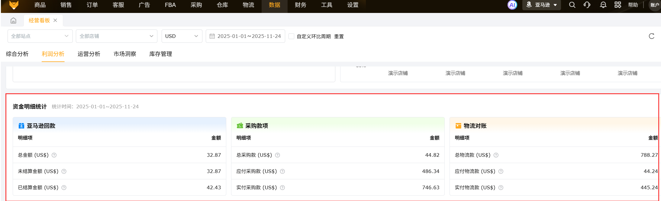 展示企业负责人日常关注的资金款项包括亚马逊回款、采购款项、物流款项,进而了解企业的财务情况。