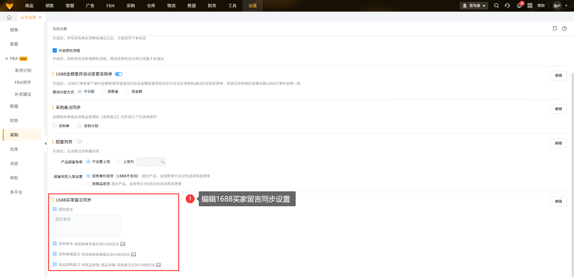 自定义选择固定留言、采购单号、采购单备注、商品采购备注。