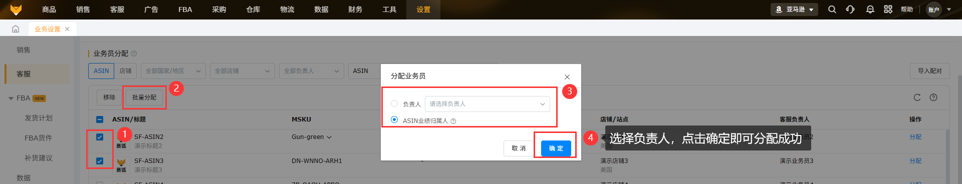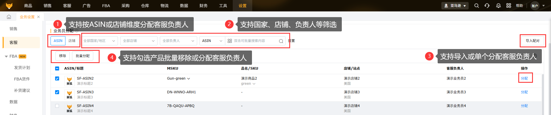 按产品分配负责人支持指定人员,或者分配给ASIN业绩归属人(当ASIN对应多个MSKU时,使用近30天销量最多MSKU的业绩归属人);