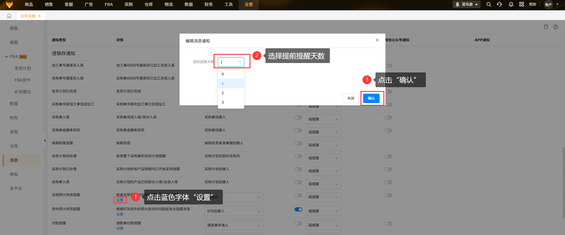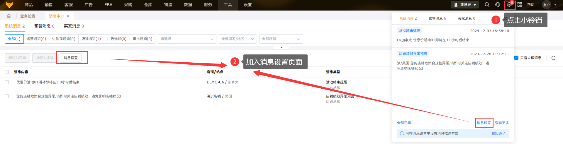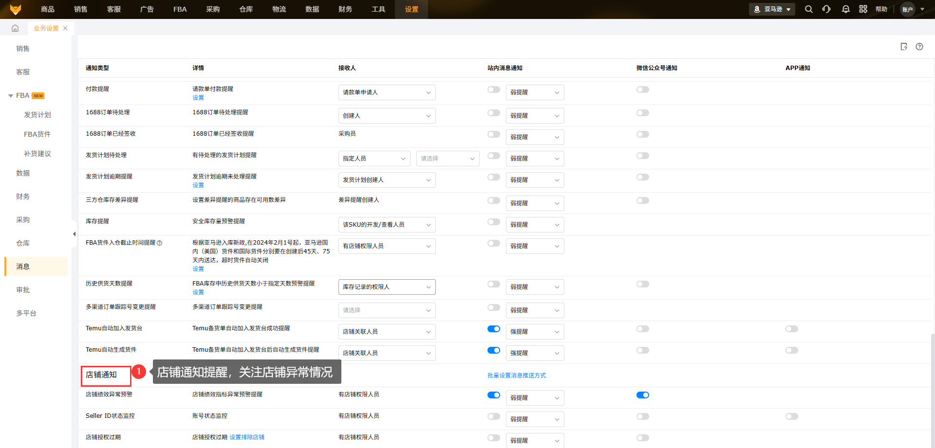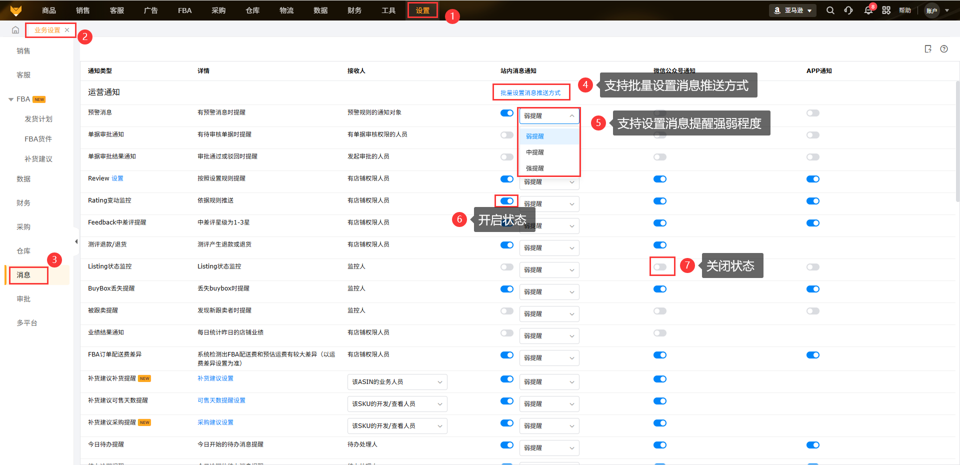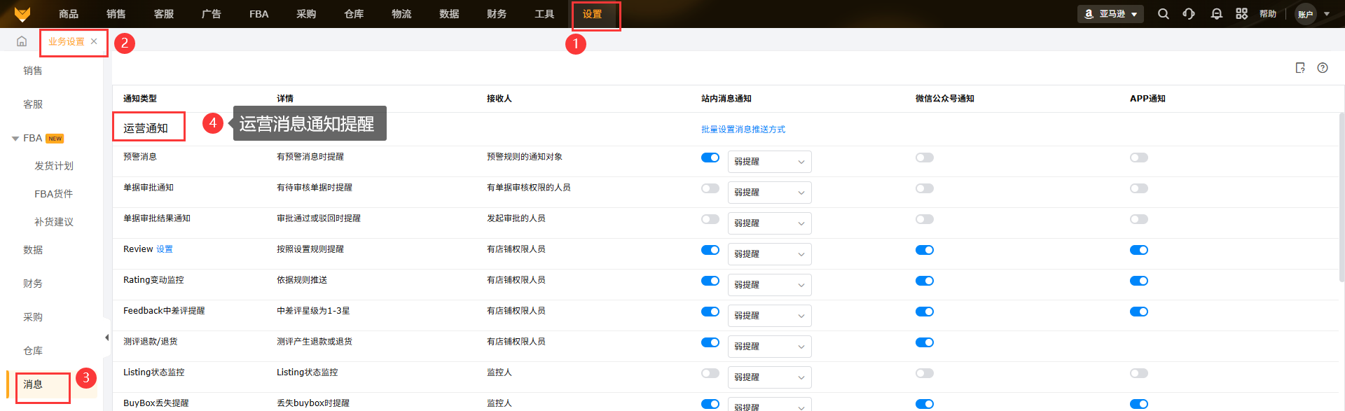 入口1:可在【设置】>【业务设置】>【消息】进行关闭/开启操作,系统默认开启。