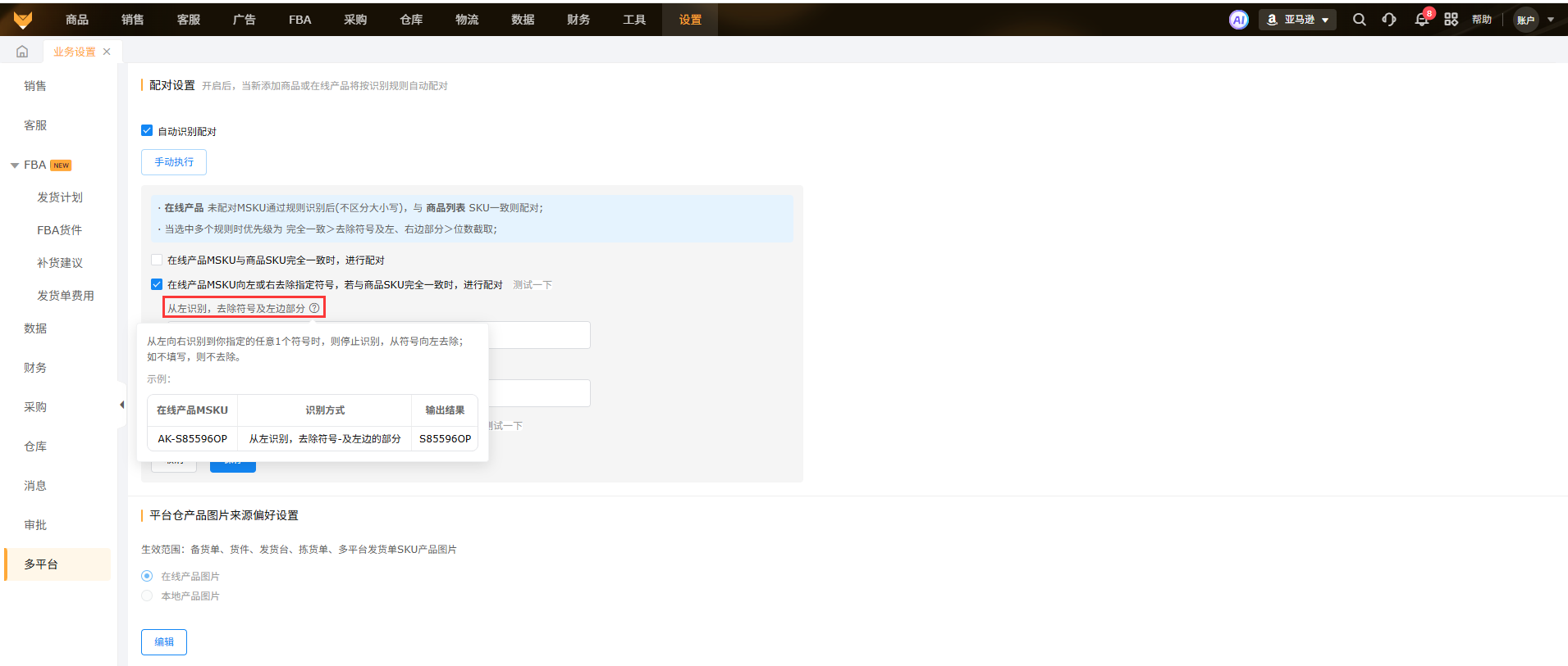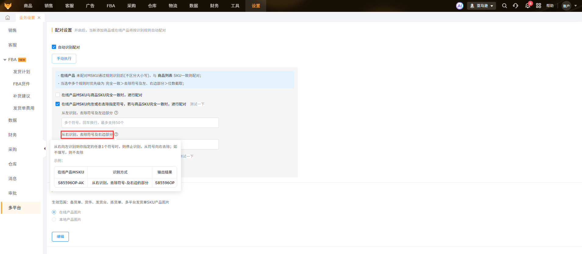 (2)多平台在线产品MSKU向左或向右去除指定符号,若与商品SKU完全一致时,进行配对。