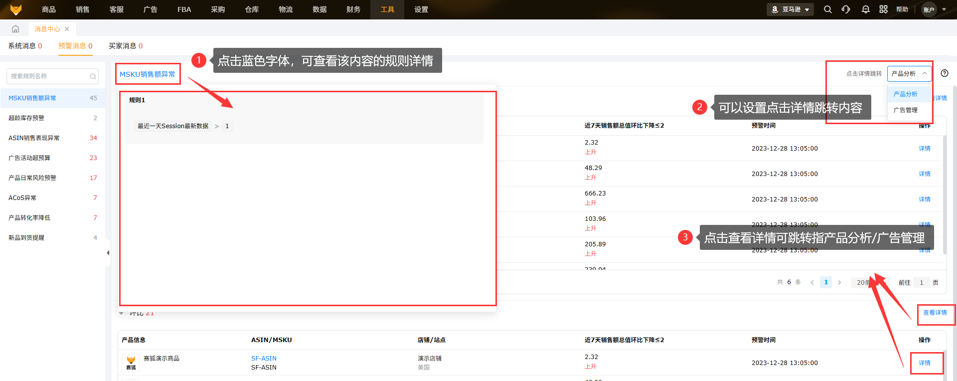 店铺绩效异常预警:店铺绩效指标异常预警提醒,每8小时更新一次,有异常数据会立即提醒;