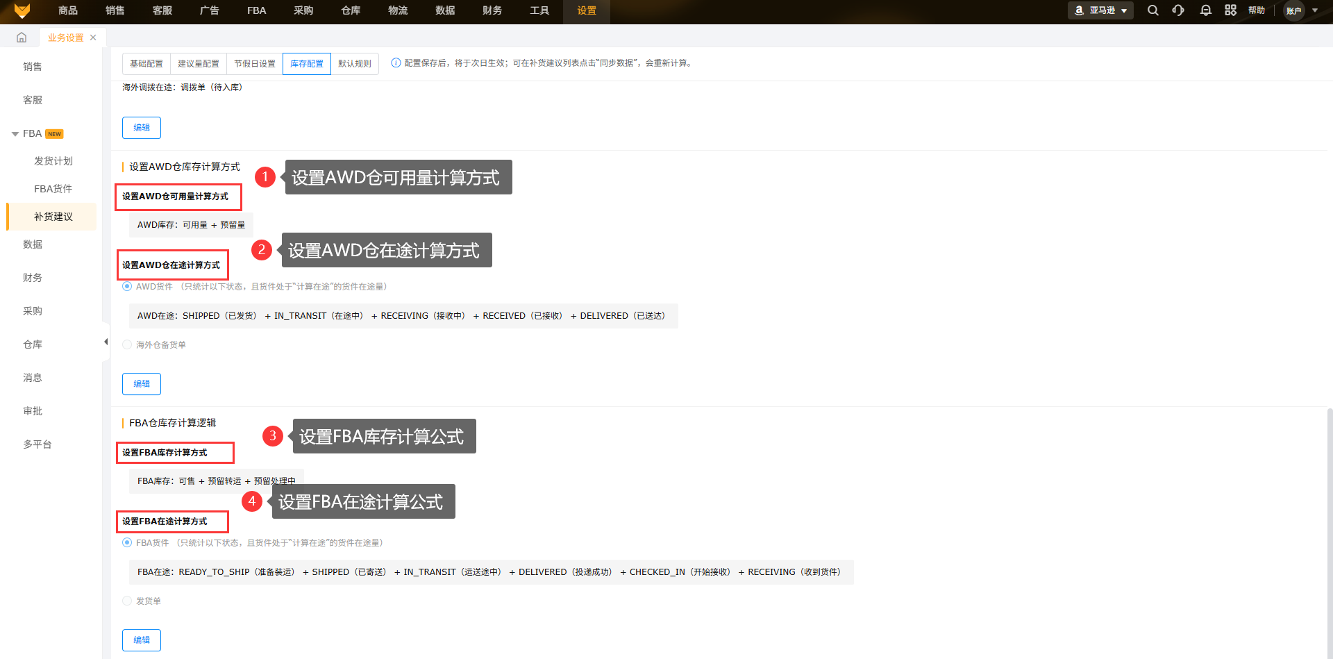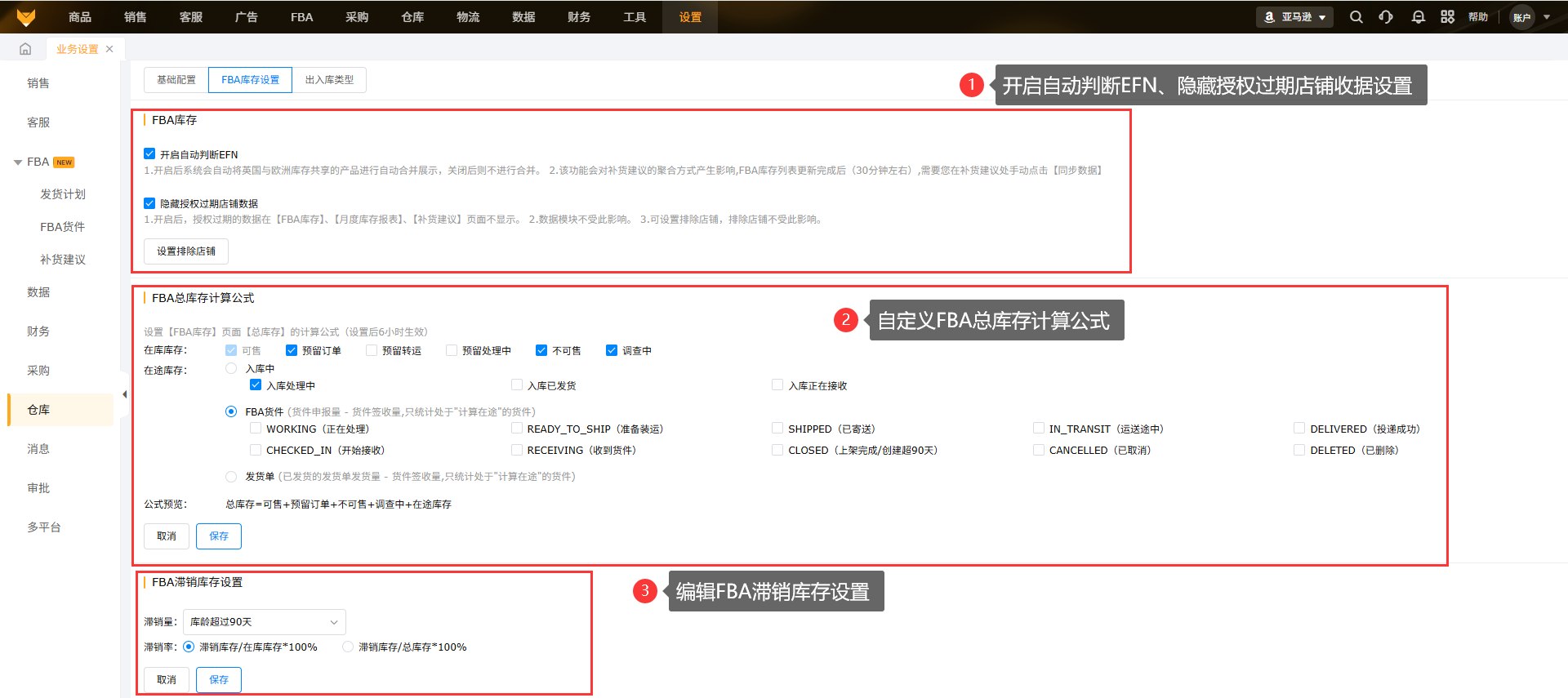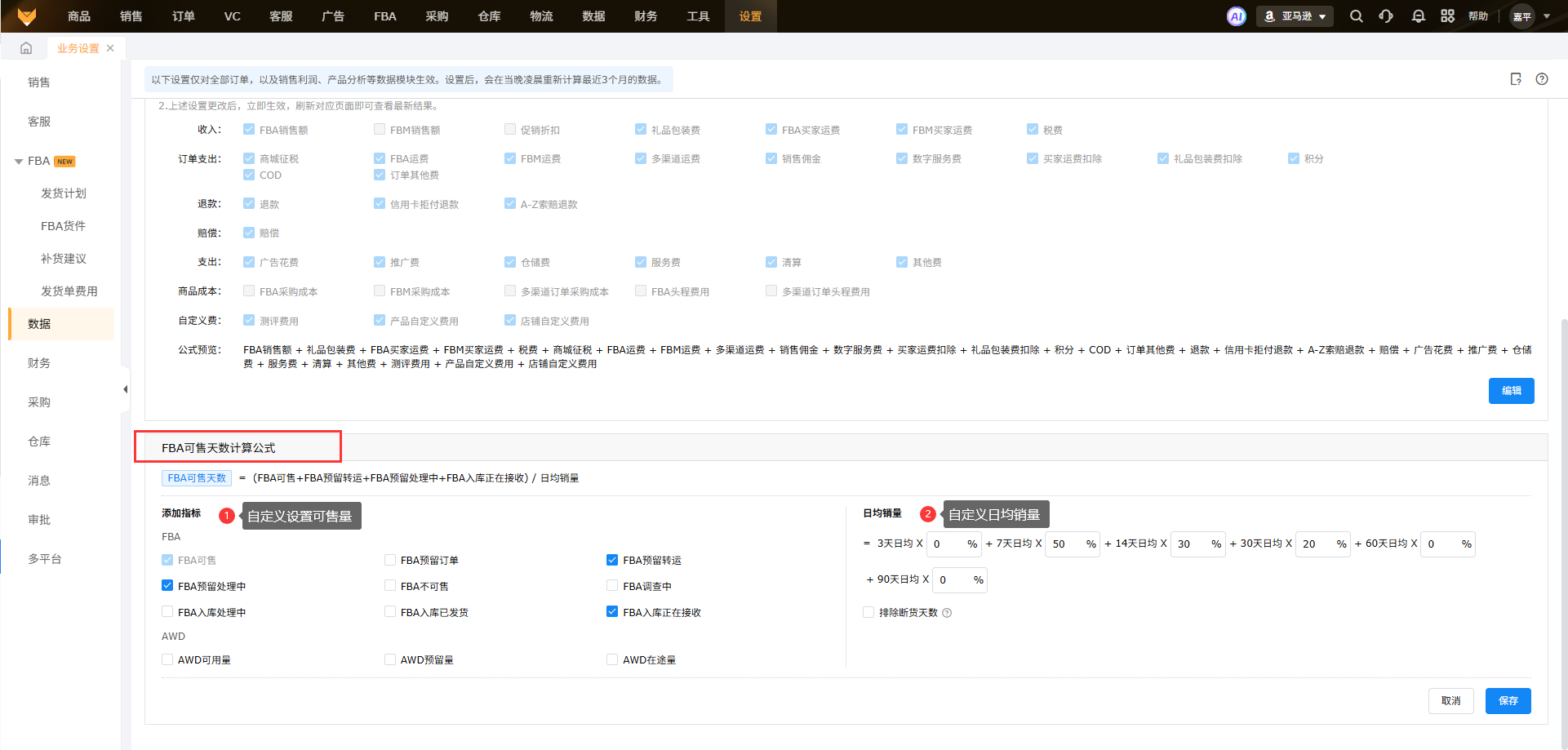 设置【FBA库存】页面【总库存】的计算公式,可自定义勾选计算字段。