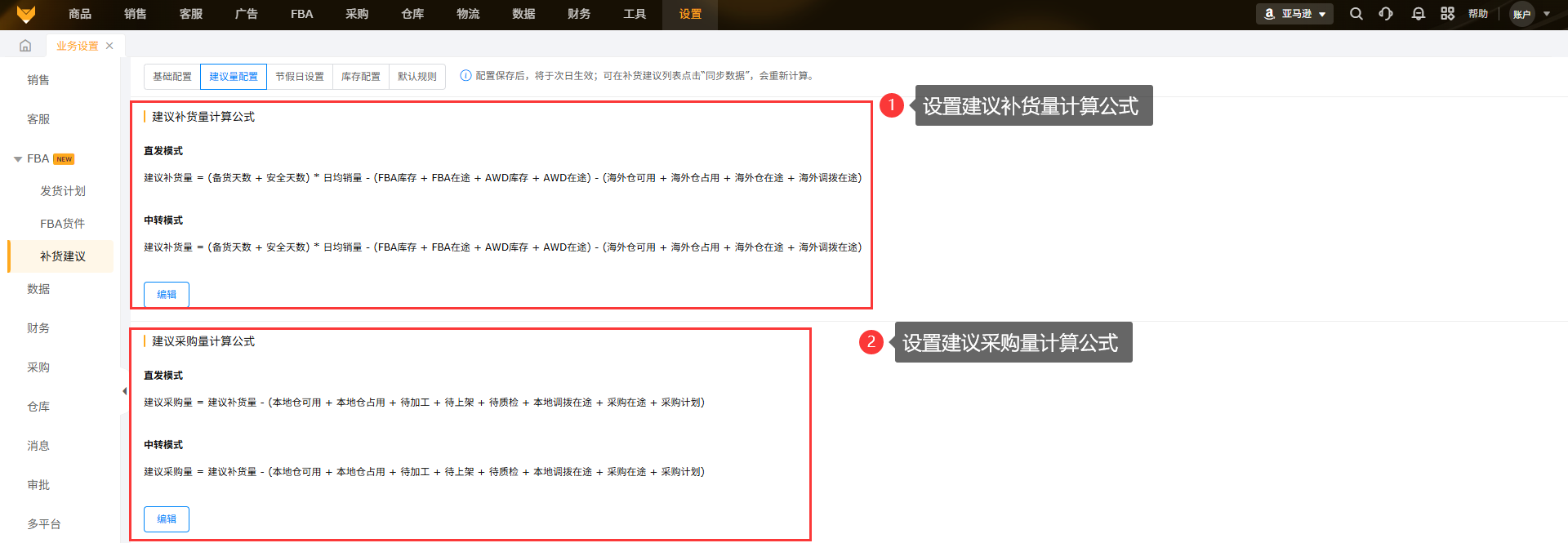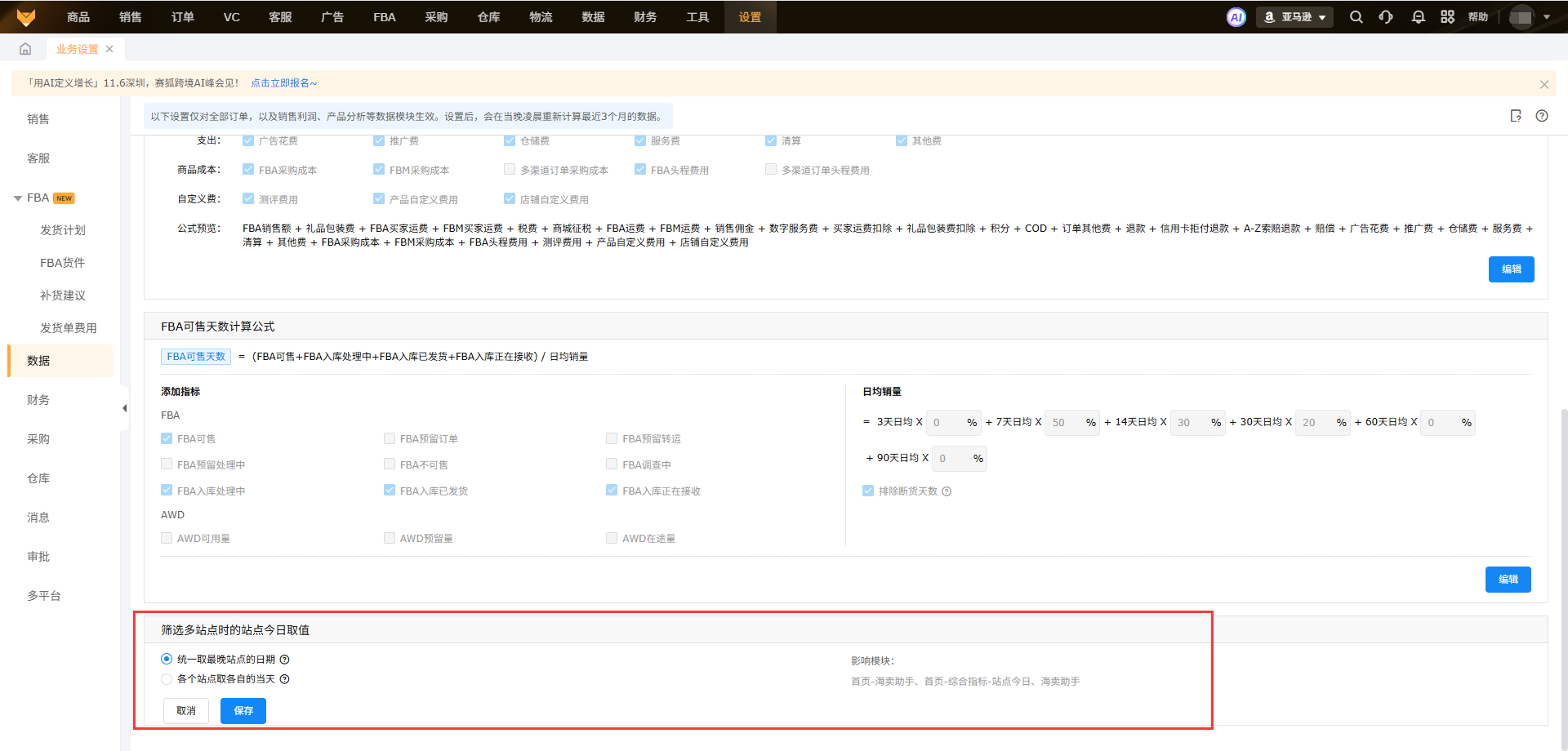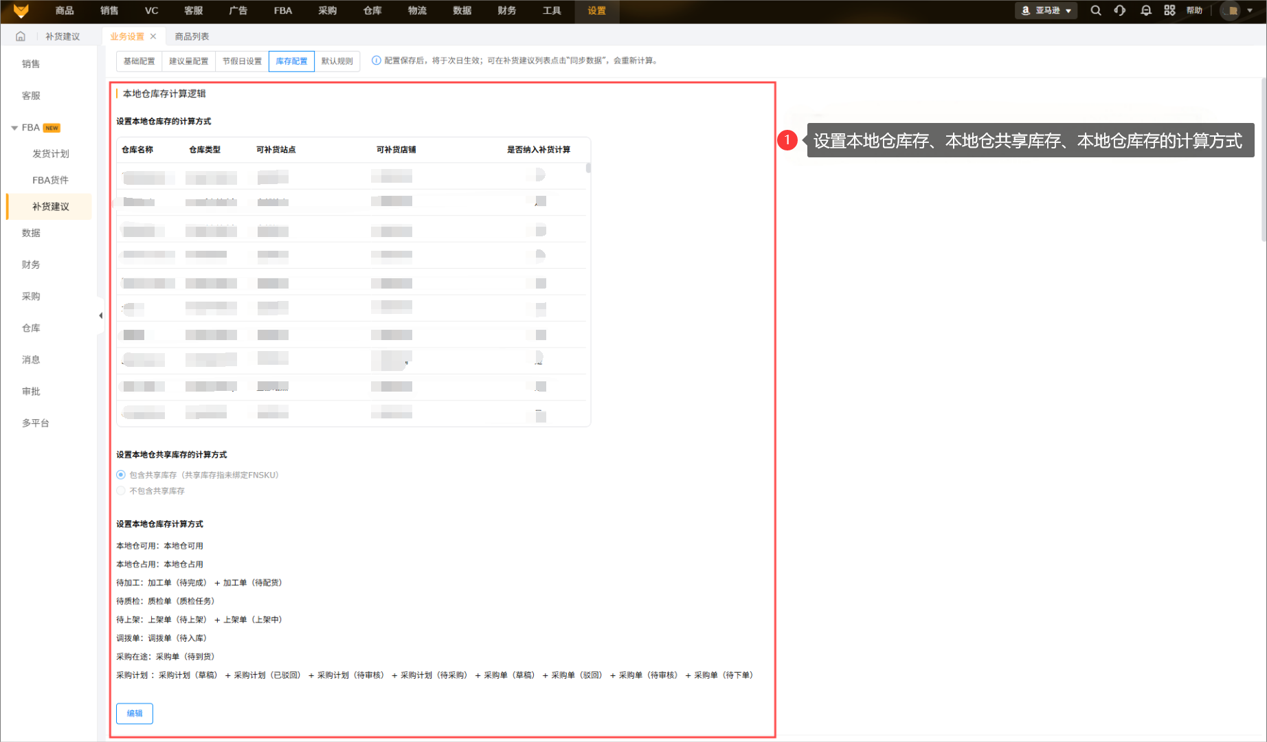 设置【FBA库存】页面【总库存】的计算公式,可自定义勾选计算字段。