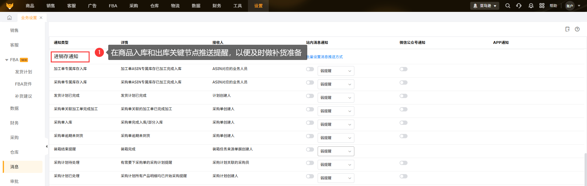 采购单专属库存入库:当采购单ASIN专属库存已加工完成入库时,会立即提醒相关人员。