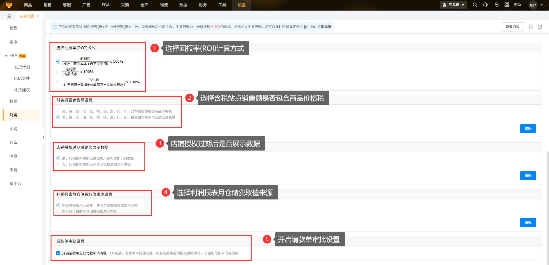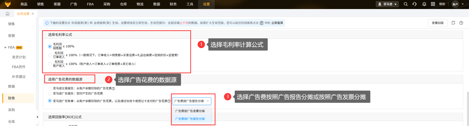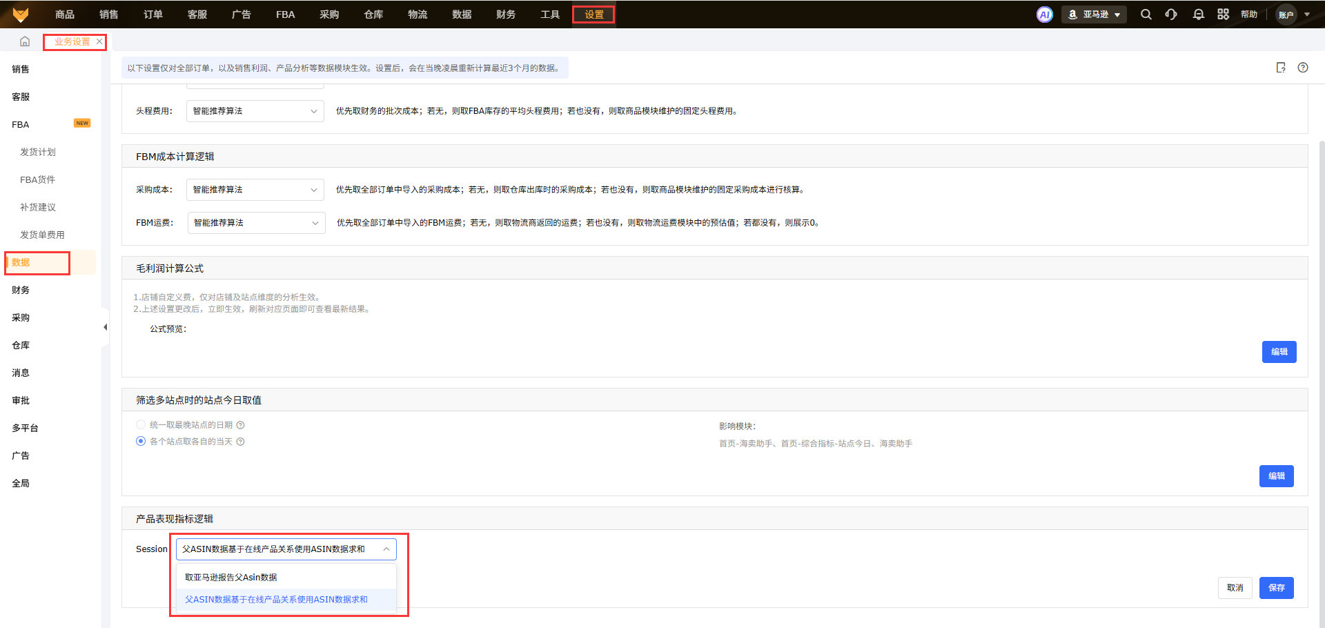 财务板块,设置修改后立即生效,生效范围为:全部店铺上个月的数据。如需扩大生效范围,您可以前往利润报表点击“计算器”图标进行立即重算