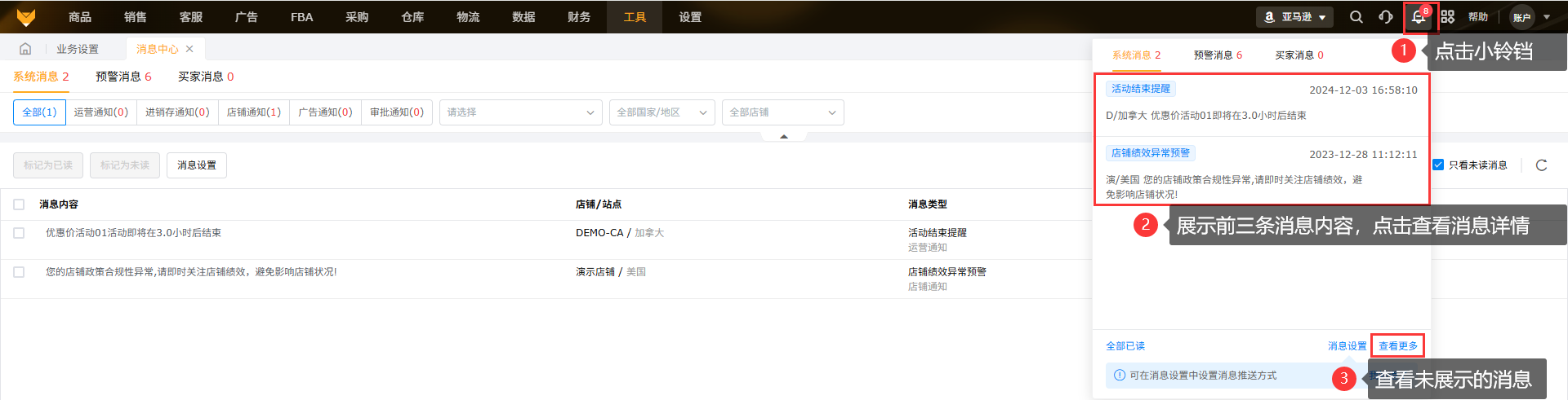 实时查看最新消息内容,点击页面右上角小铃铛,展开页面显示最新3条消息提醒;