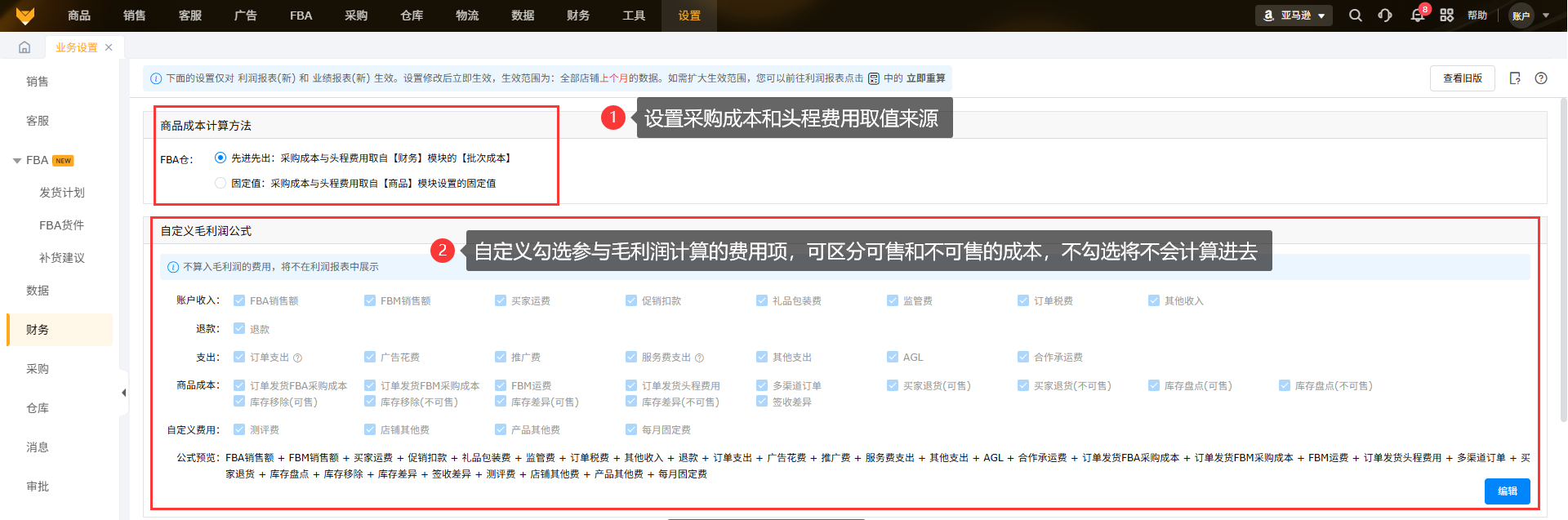 毛利润的计算公式可以自定义勾选参与计算利润的费用项;可区分可售和不可售成本,不勾选将不会计算;