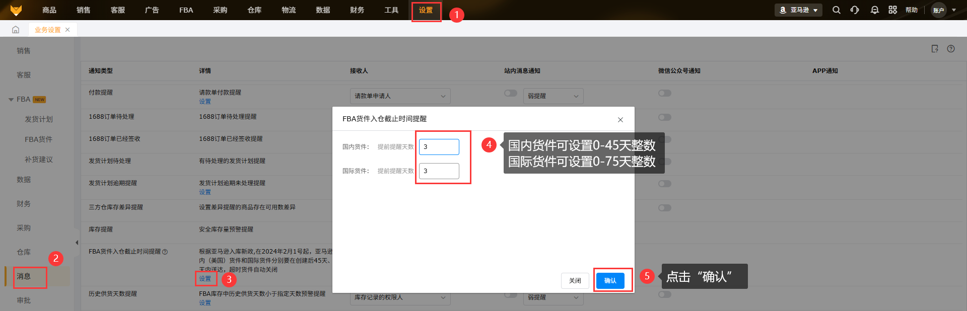 FBA货件入仓截止时间提醒:当货件是美国站点,且货件状态不是CLOSED\CANCELLED\DELETED,寄件地址为美国以外的国际货件可设置提前0-75天提醒,寄件地址为美国以内的国内几件可设置提前0-45天提醒, 当前创建时间+75天或者45天-提前提醒天数,货件在2024年2月1号起创建, 每天十点提醒一次。