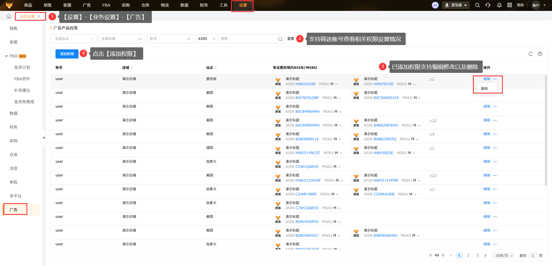 支持按照ASIN的维度为子账号设置广告活动权限(例:一个广告活动拥有产品A\B\C,子账号拥有A产品权限,即可看到该广告活动所有数据)
