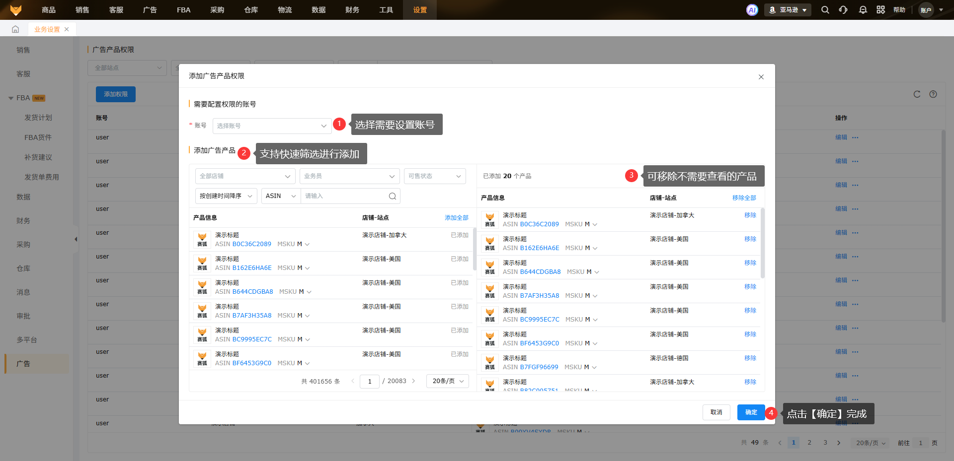 支持针对店铺站点、业务员、状态以及产品快速筛选搜索进行添加,设置对应账号需要查看到的产品权限