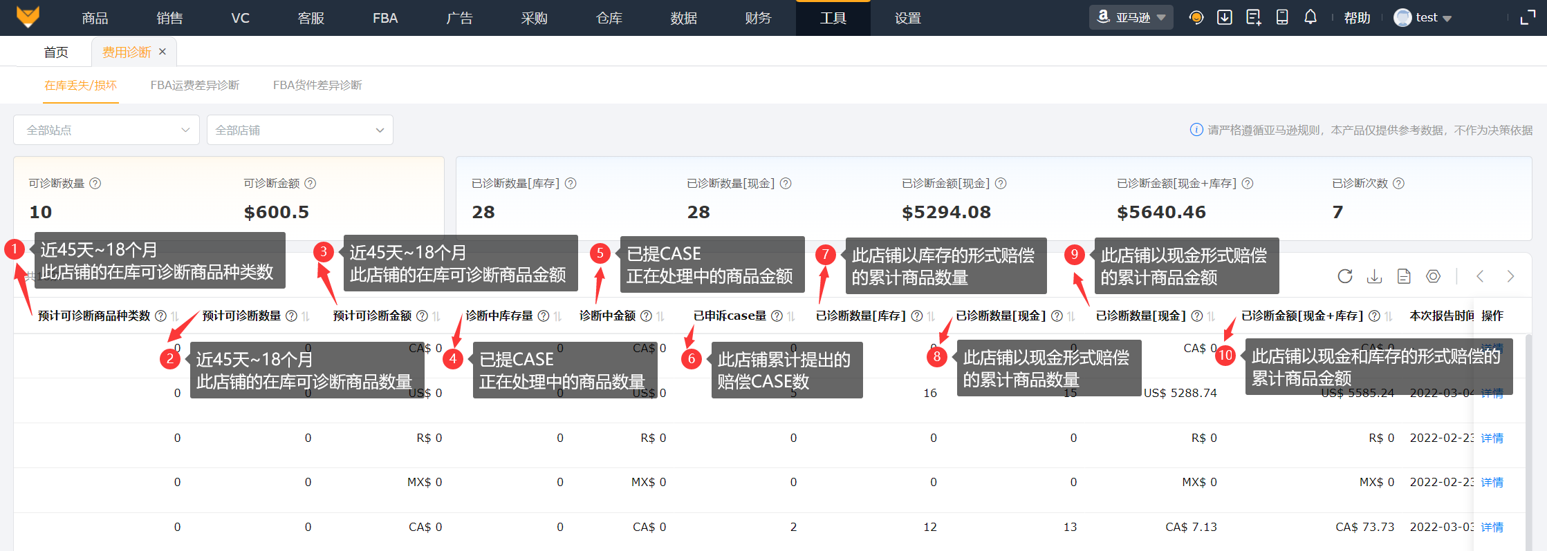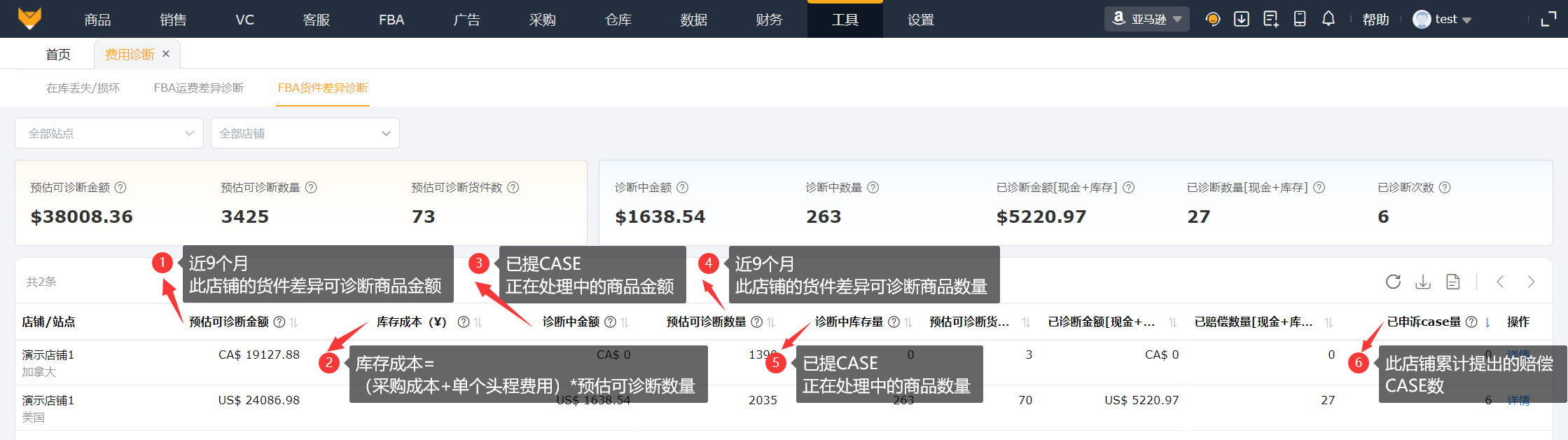 亚马逊在库丢失损坏通过库存分类账报告和亚马逊赔偿报告进行诊断;FBA运费差异通过亚马逊后台预估费用报告进行诊断;FBA货件差异通过FBA货件页面签收量、库存分类账进行诊断。