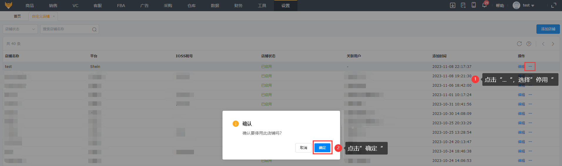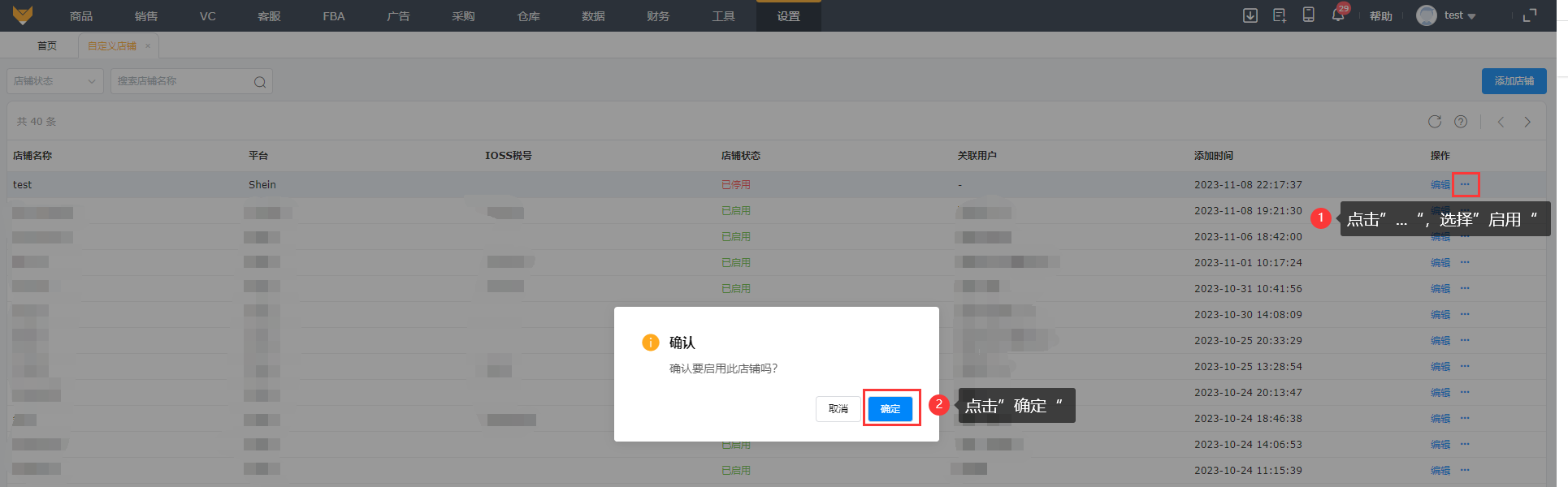 可以对已启用/已停用状态的店铺进行停用/启用操作。