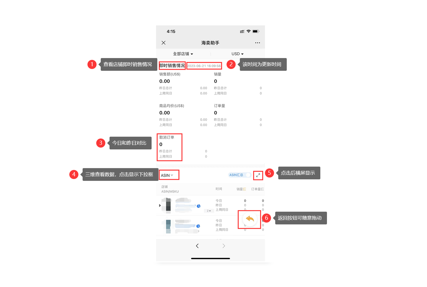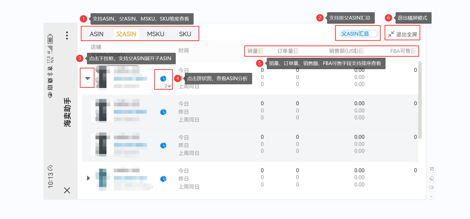1.2 点击“海卖助手”,可查看店铺即时销售情况和产品即时销售情况,页面显示的时间为更新时间,展示单品今日、昨日和上周同日销量数据,以及显示FBA可售字段。