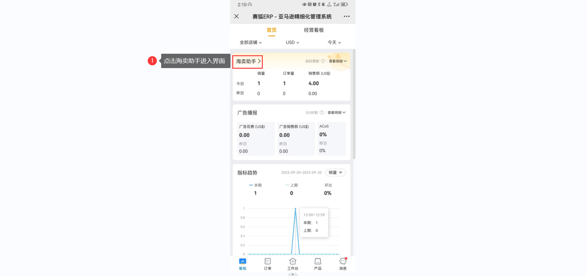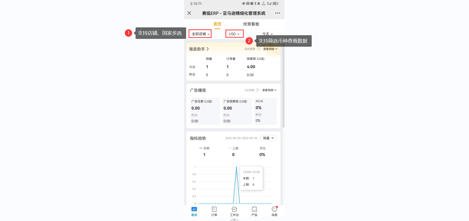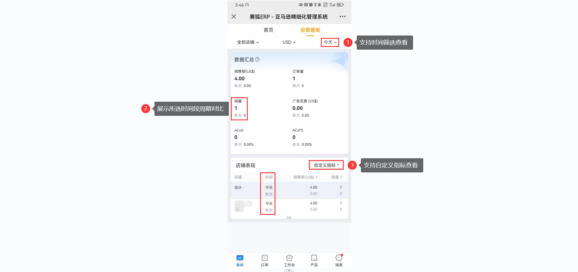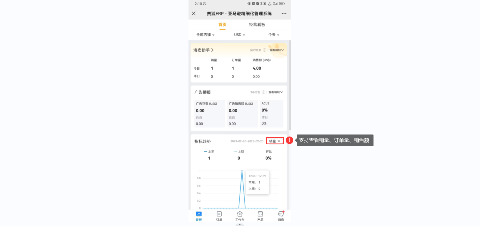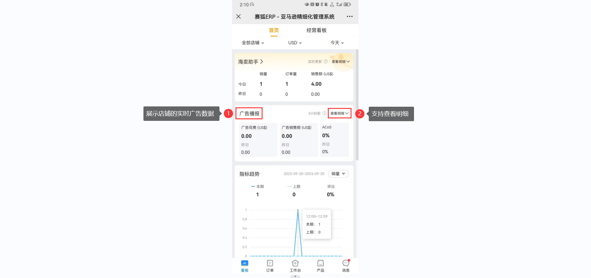经营看板详情页: 展示销售额、销量、订单量、广告花费、ACoS、ACoTS等数据。