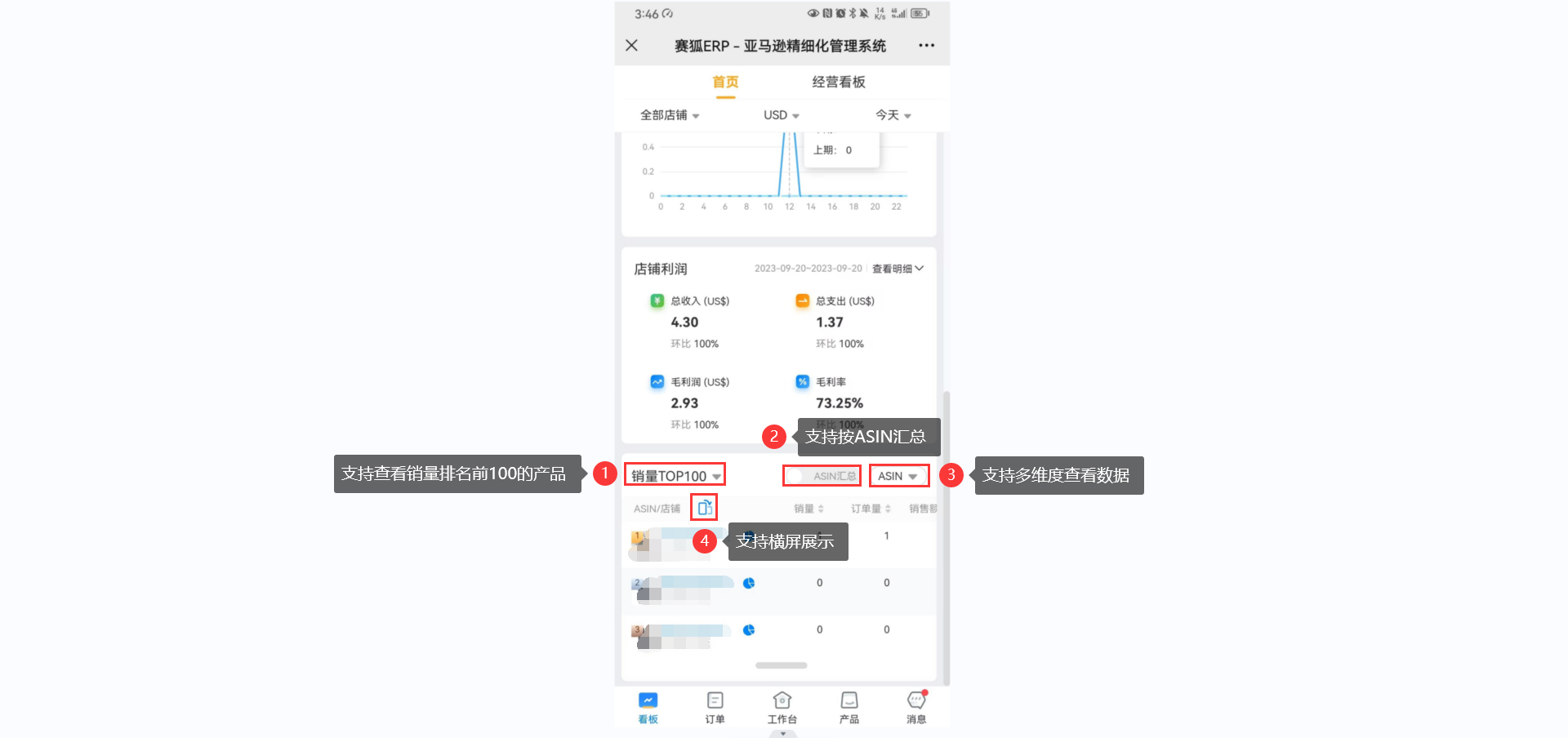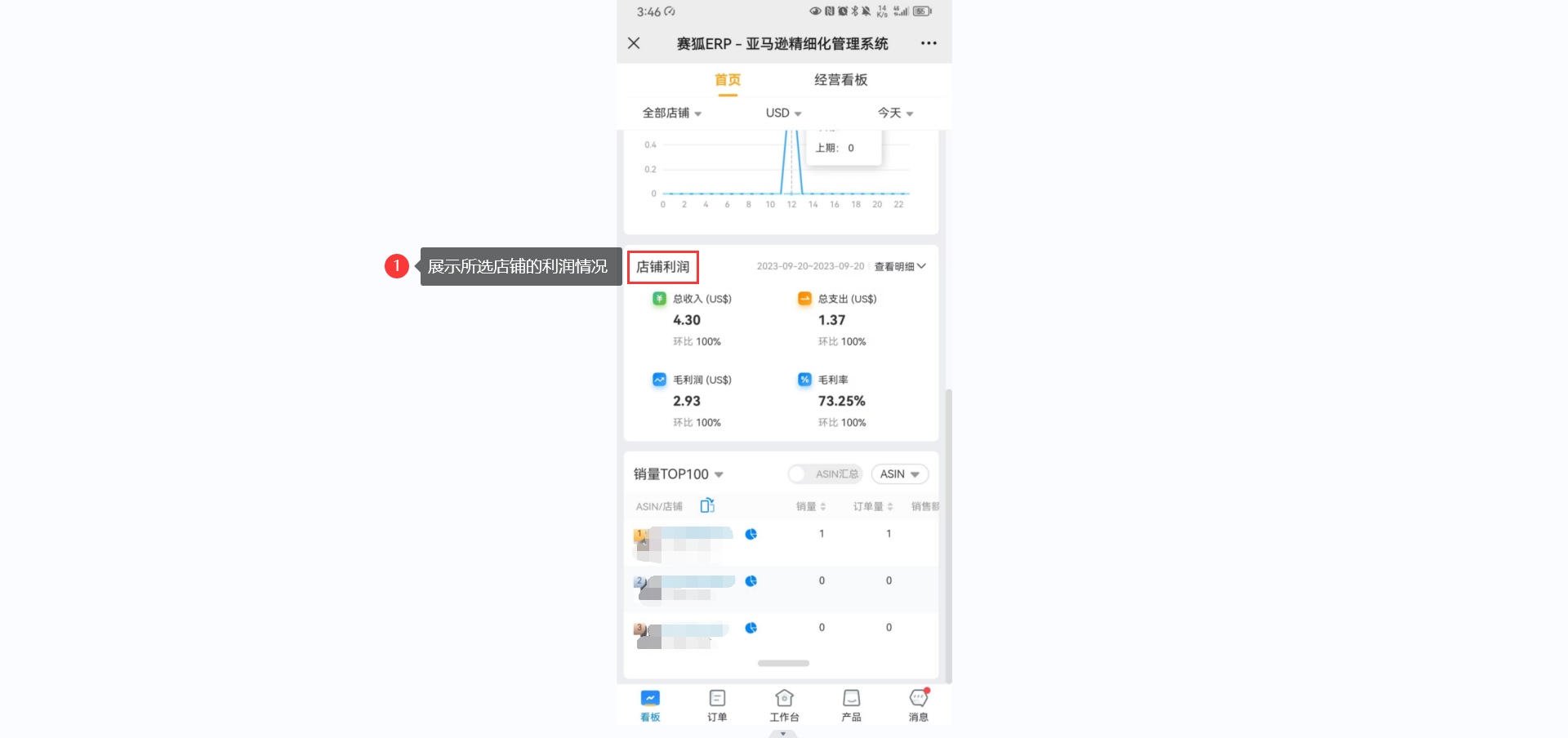 1.5 支持查看所选店铺的利润情况,包含总收入、总支出、毛利润和毛利率。
