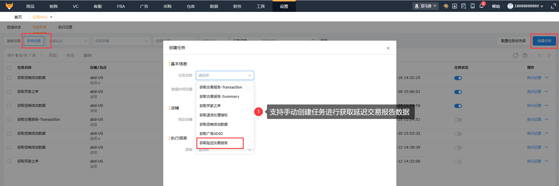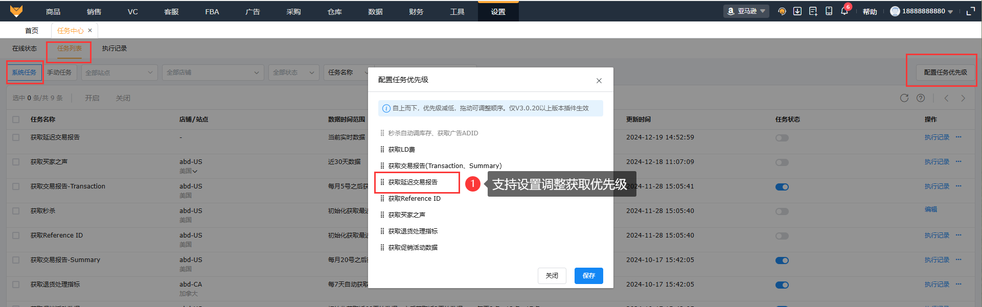 在【设置】-【任务中心】页面,需要保持插件在线,开启获取延迟交易报告任务状态,插件将按任务获取当前实时数据。支持按系统任务每天自动获取一次,可调整延迟交易报告数据获取优先级。同时也支持手动创建任务立即执行获取延迟交易报告。
