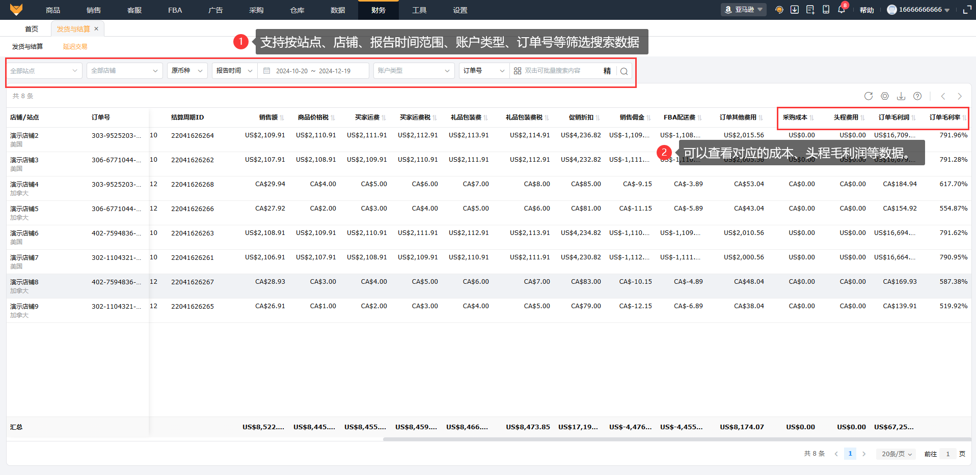 支持按站点、店铺、报告时间范围、账户类型、订单号等筛选搜索数据,可以查看对应的成本、头程毛利润等数据。