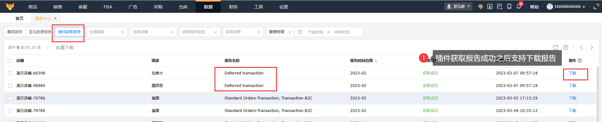 在【数据】【报告中心】-插件获取报告页面,数据获取完成之后支持下载。